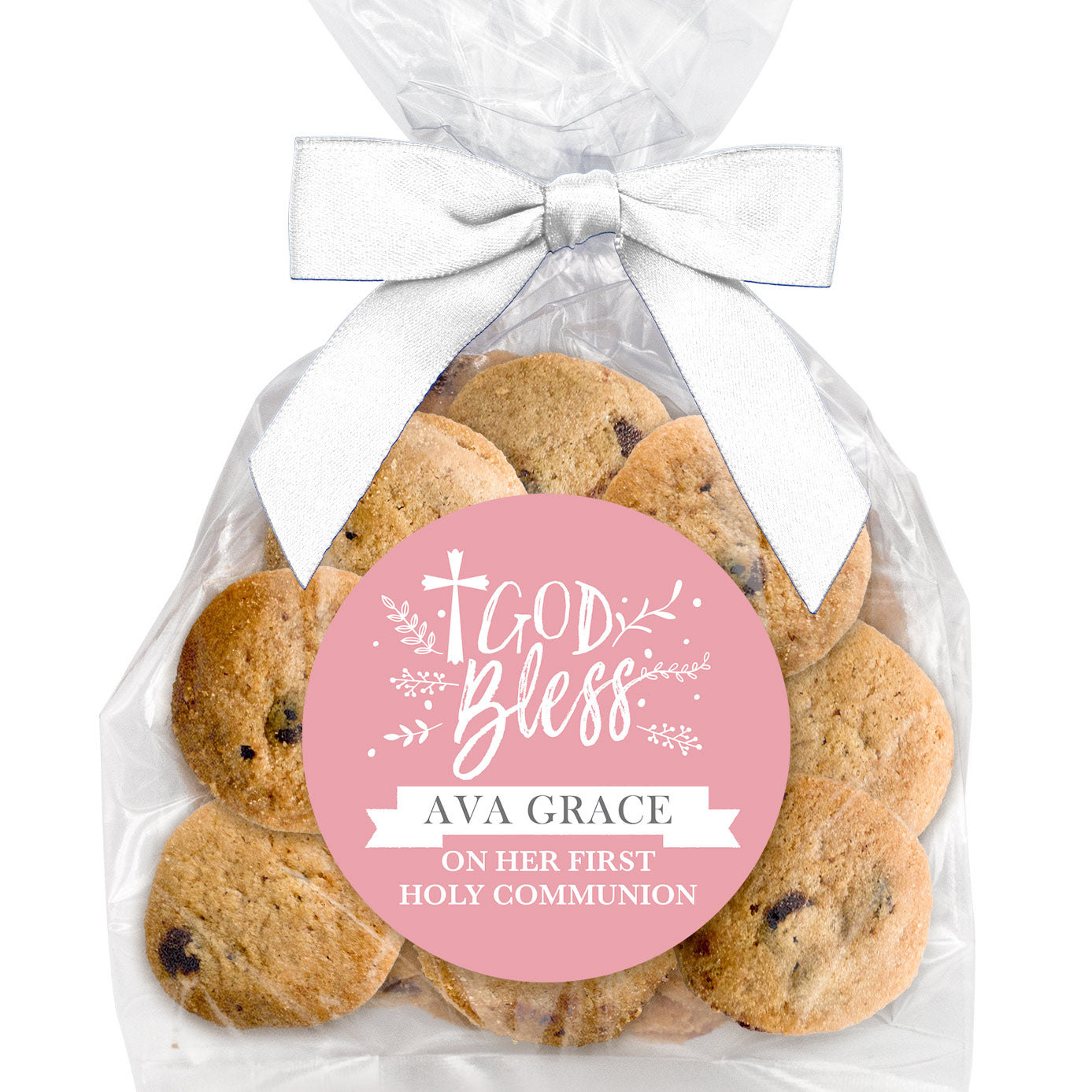 Mini Chocolate Chip Cookies: Approximately 14 mini cookies come in a bag with a custom sticker and ribbon. They are easy to hand out at larger gatherings.