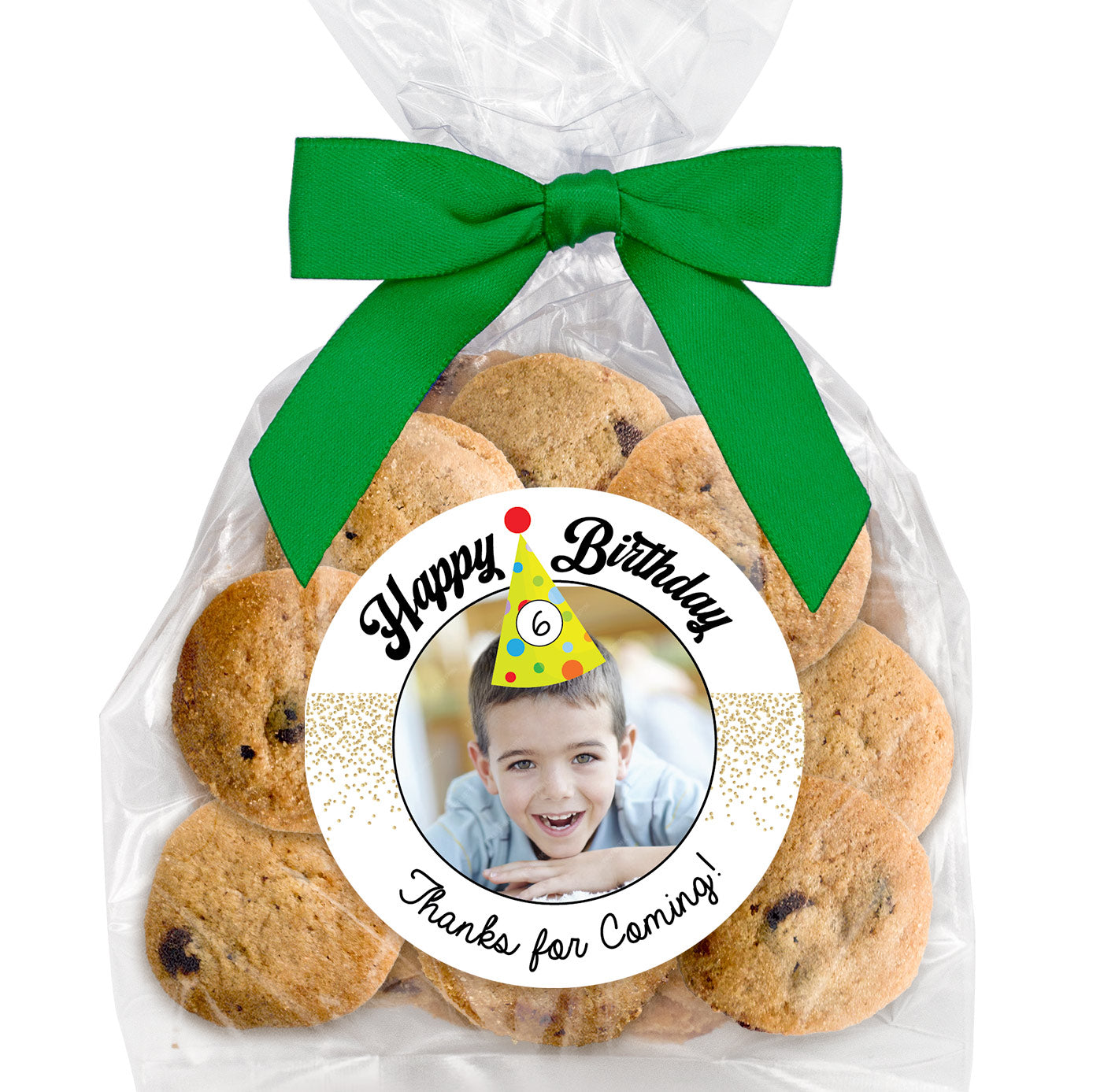 Birthday Party Hat & Photo upload - Bite-Sized Chocolate Chip Cookies (3 oz., approx. 21 cookies) W/ Full Color Custom Sticker & Bow Choice