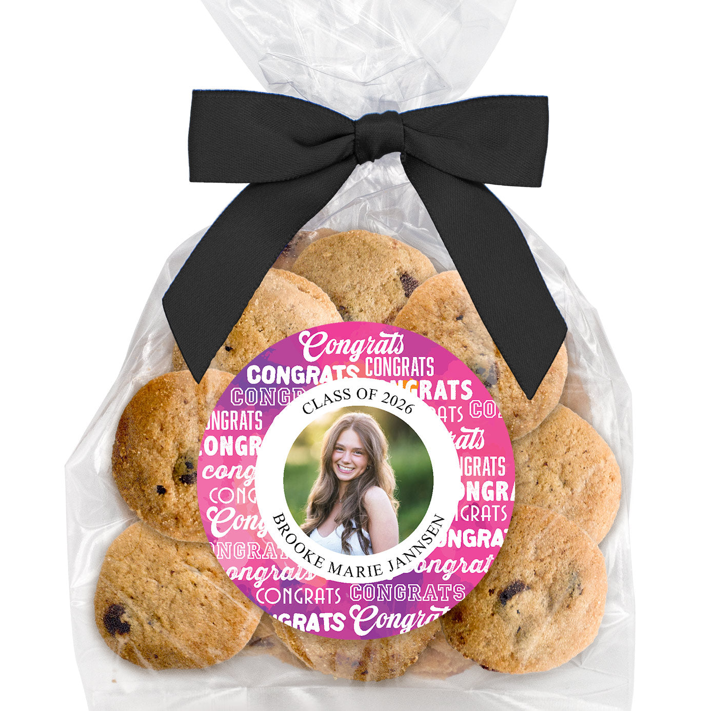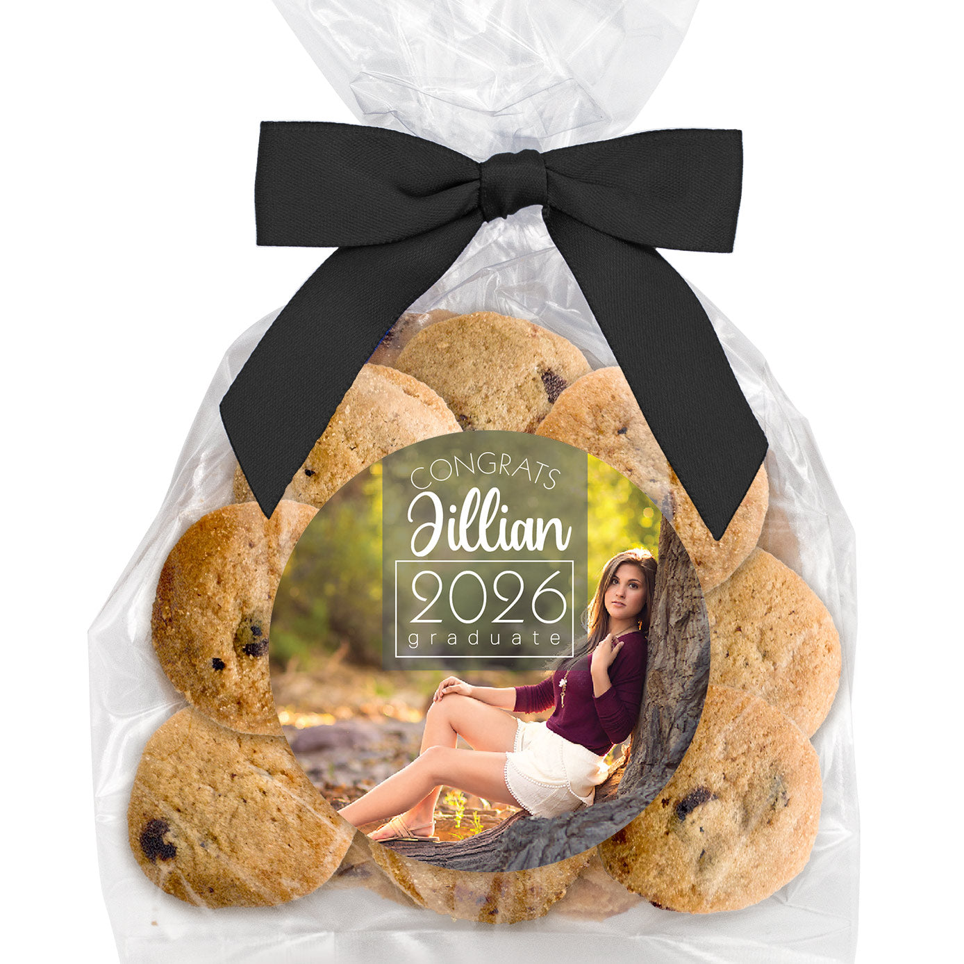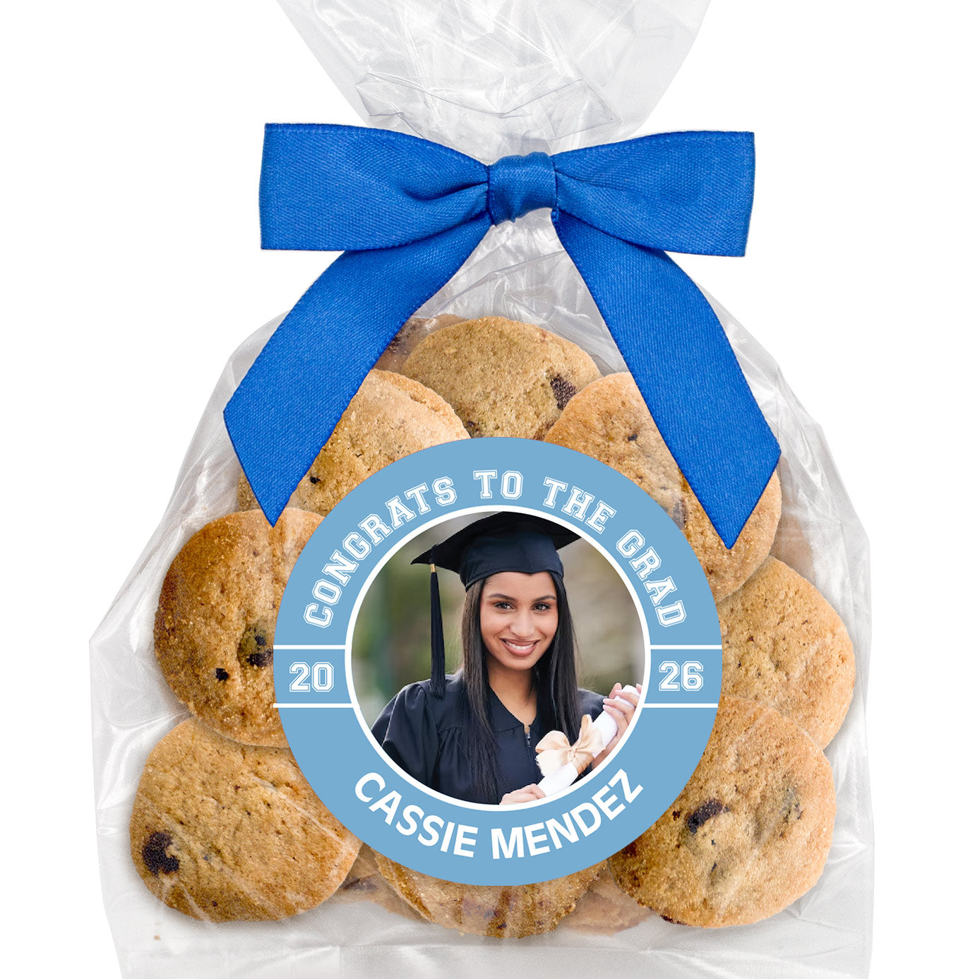 Grad Congrats Photo - Bite-Sized Chocolate Chip Cookies (3 oz., approx. 21 cookies) W/ Full Color Custom Sticker & Bow Choice