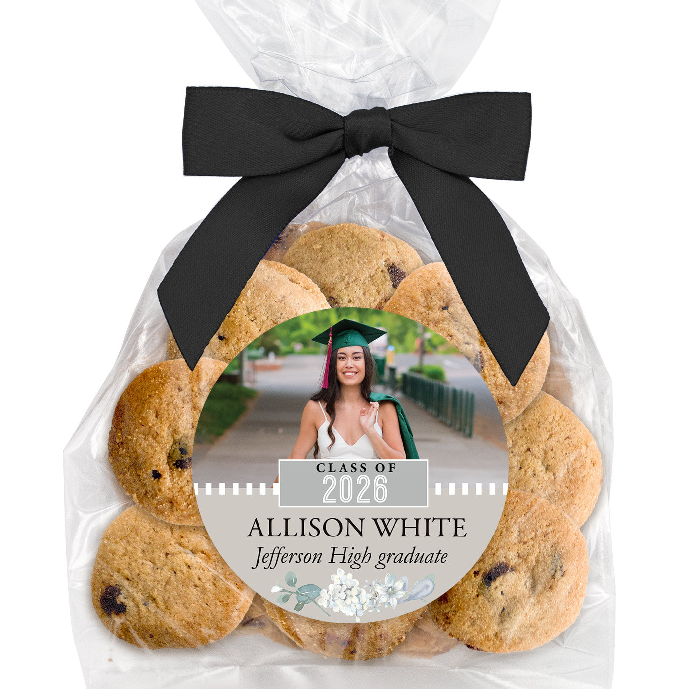 Floral Photo Grad - Bite-Sized Chocolate Chip Cookies (3 oz., approx. 21 cookies) W/ Full Color Custom Sticker & Bow Choice