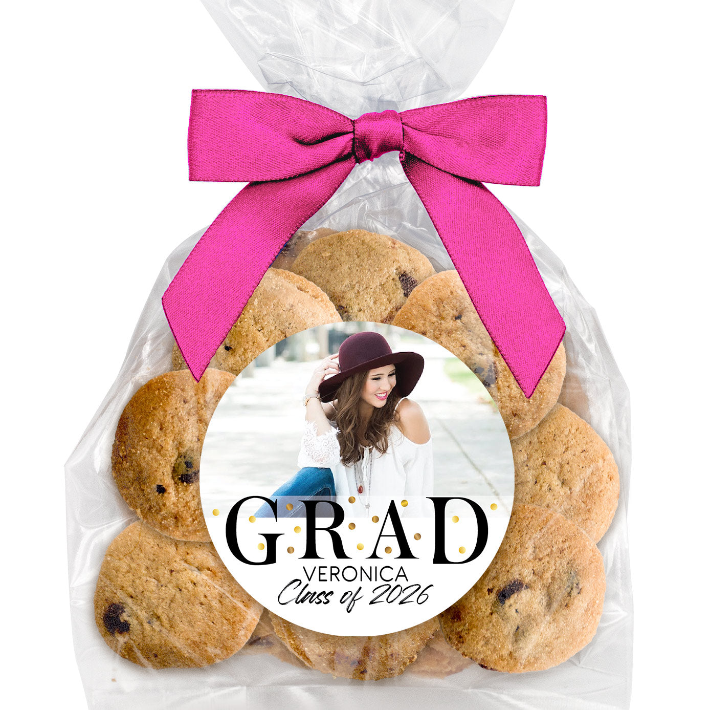 Simple Grad Photo & Polka Dots - Bite-Sized Chocolate Chip Cookies (3 oz., approx. 21 cookies) W/ Full Color Custom Sticker & Bow Choice