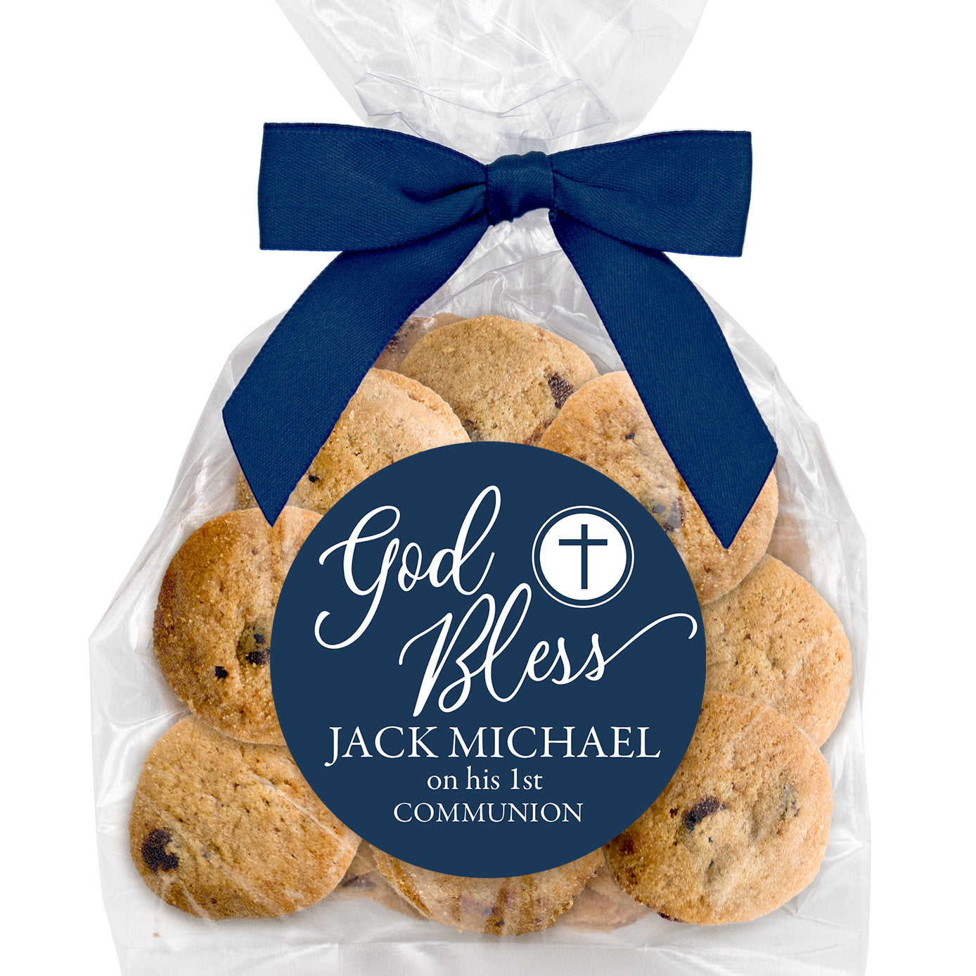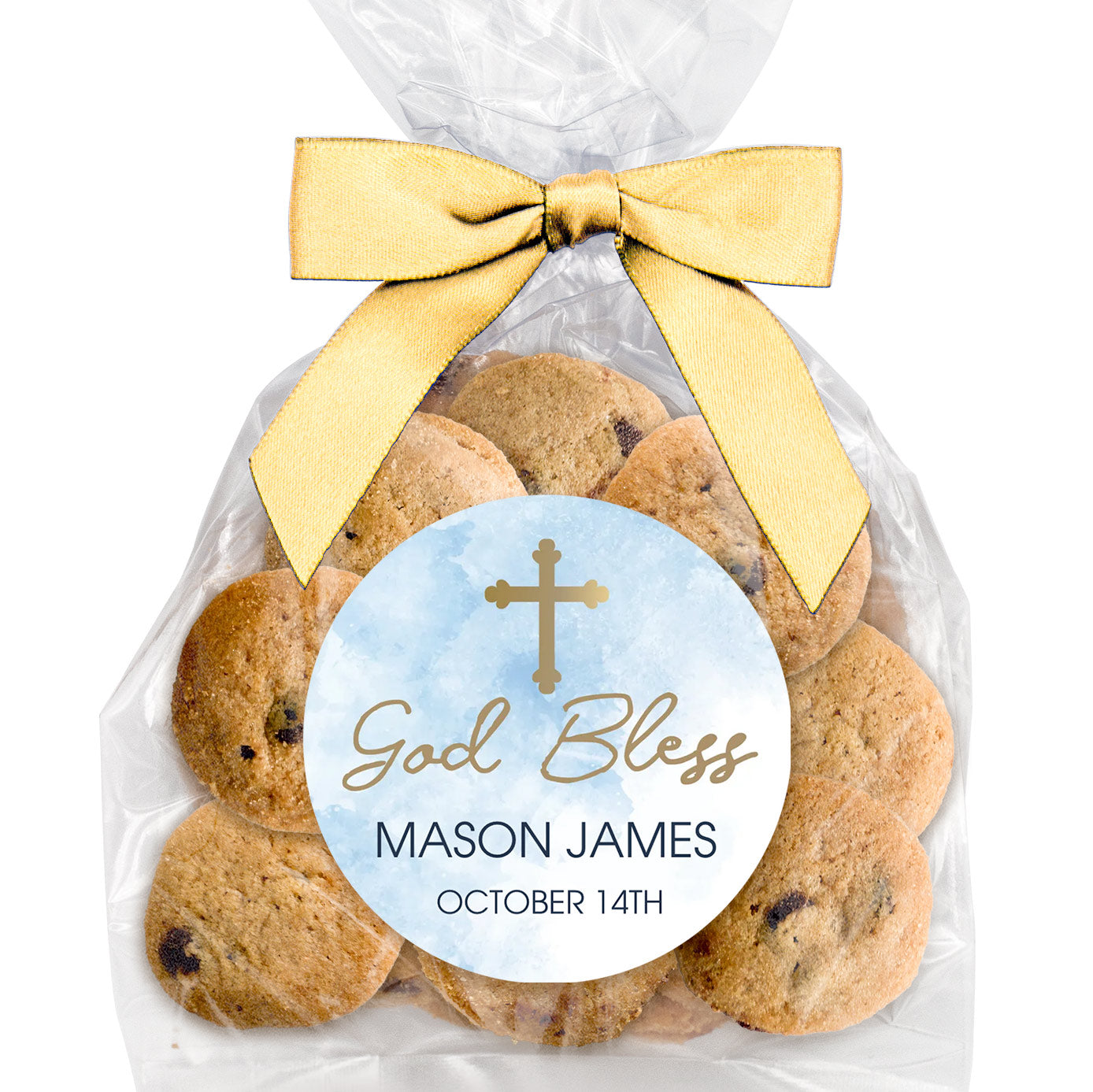 God Bless Simple Cross Photo Boy - Bite-Sized Chocolate Chip Cookies (3 oz., approx. 21 cookies) W/ Full Color Custom Sticker & Bow Choice