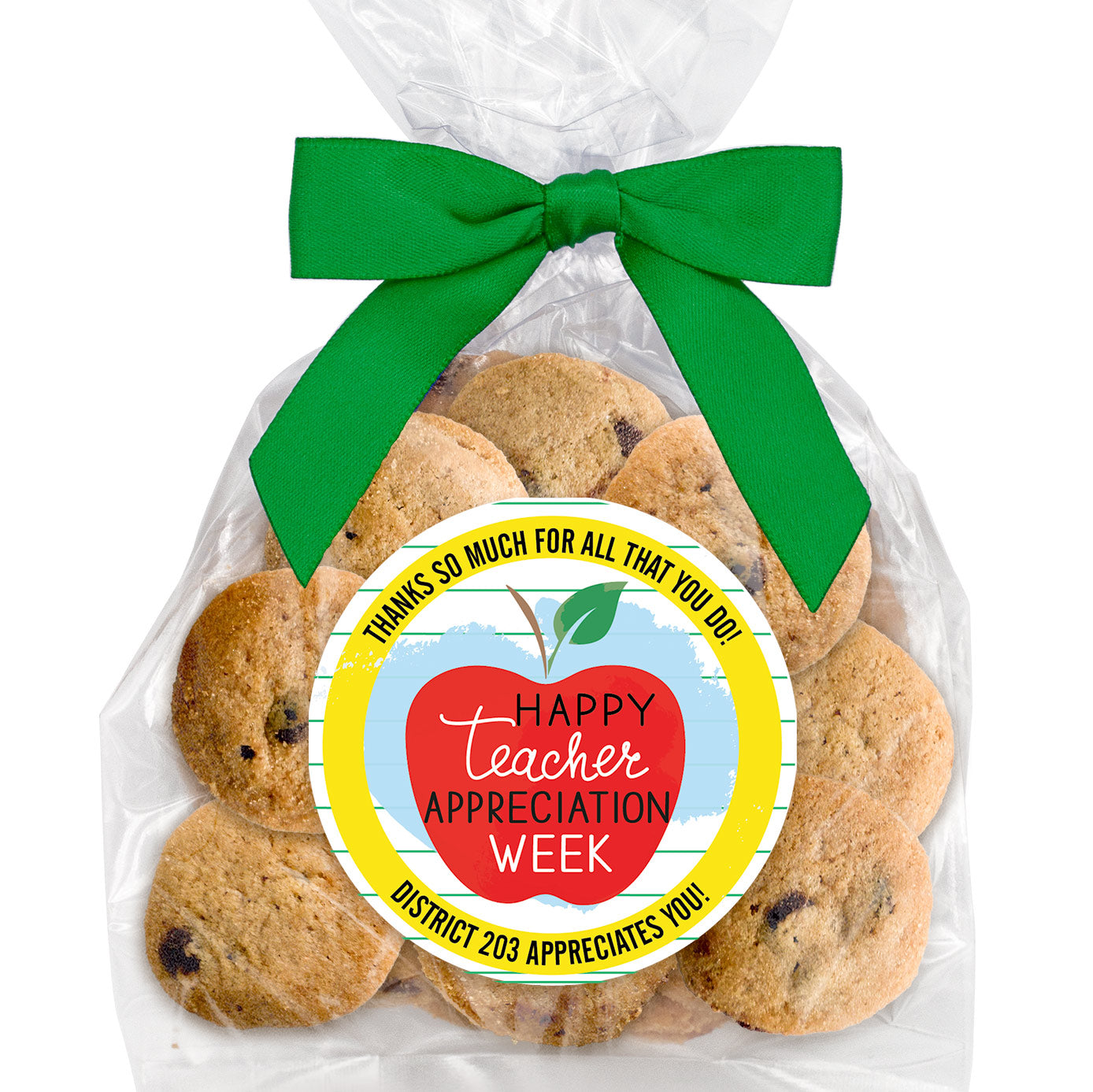Teacher Appreciation Apple and Message - Chocolate Chip Mini Cookies (3 oz) W/ Full Color Custom Sticker & Bow Choice