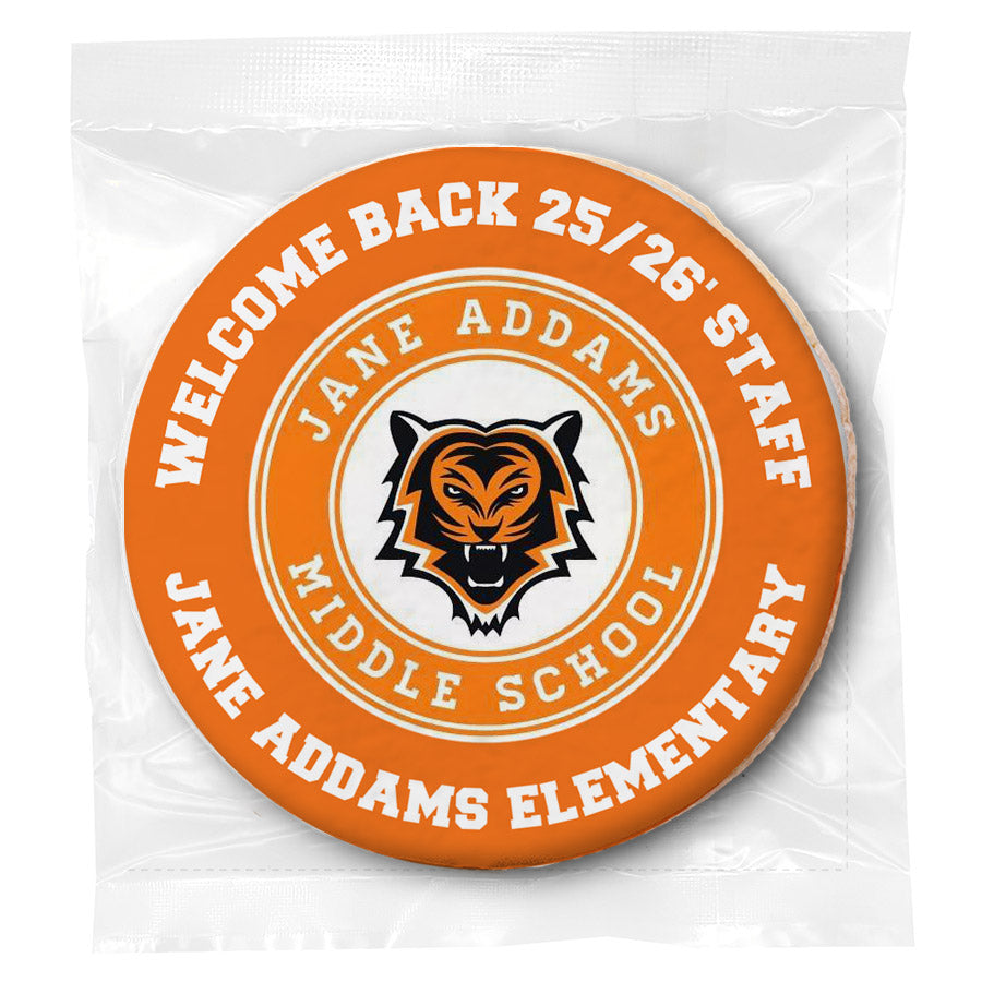 - Individually wrapped 2 oz. (3 inch) custom-printed sugar cookies.