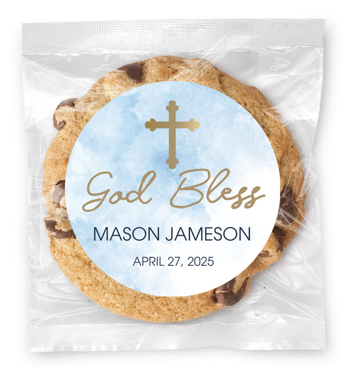 God Bless Blue Clouds Cross - Gourmet Chocolate Chip Or Variety Pack W/ Full Color Personalized Sticker