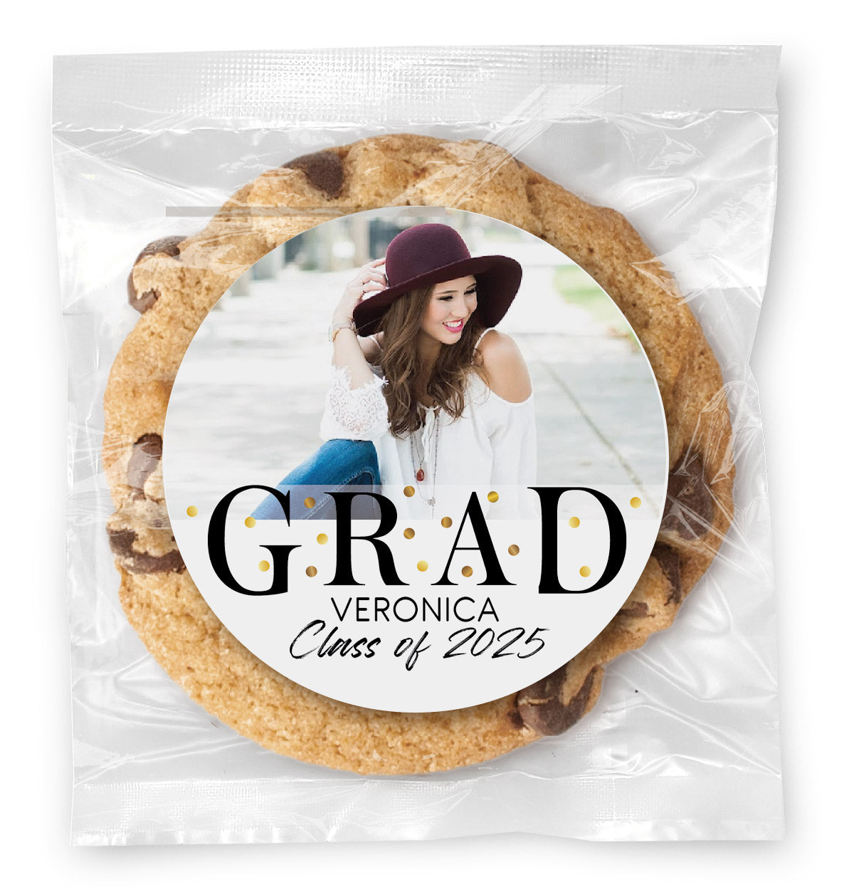 Simple Grad Photo & Polka Dots - Gourmet Chocolate Chip Or Variety Pack W/ Full Color Personalized Sticker