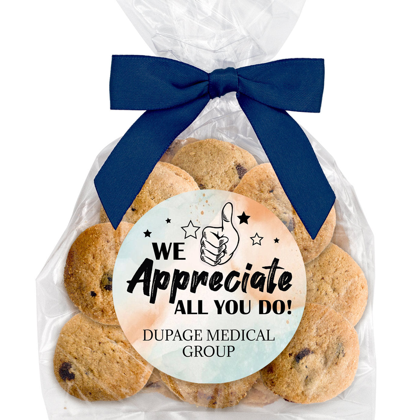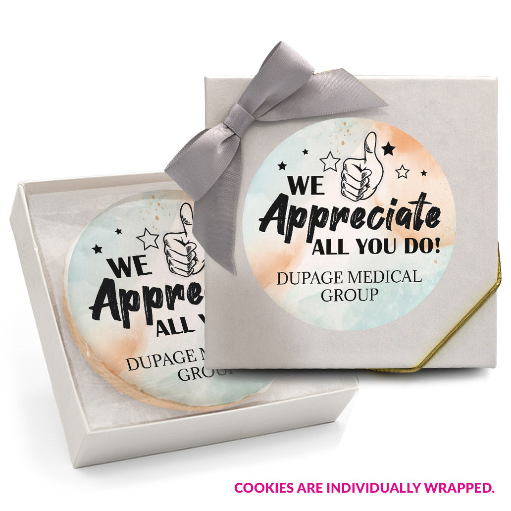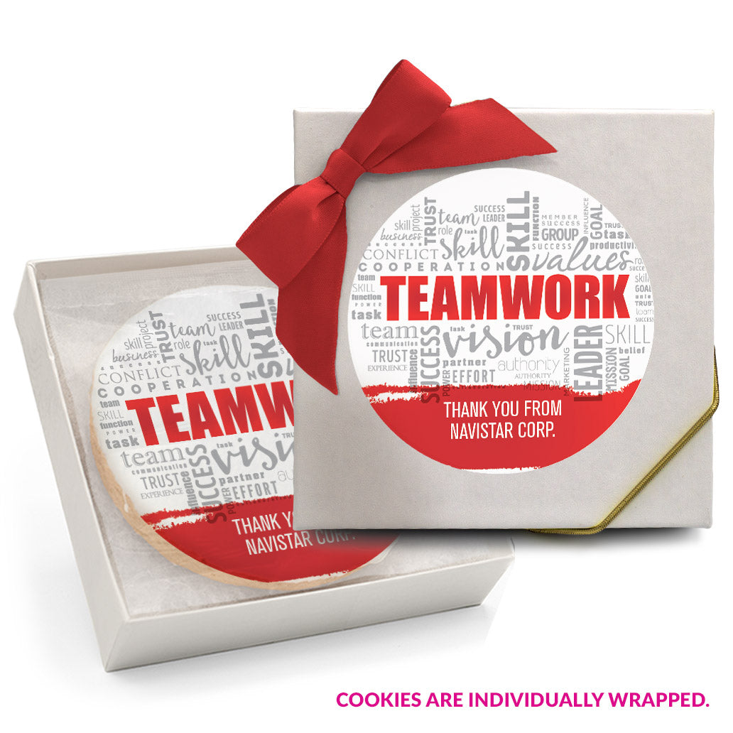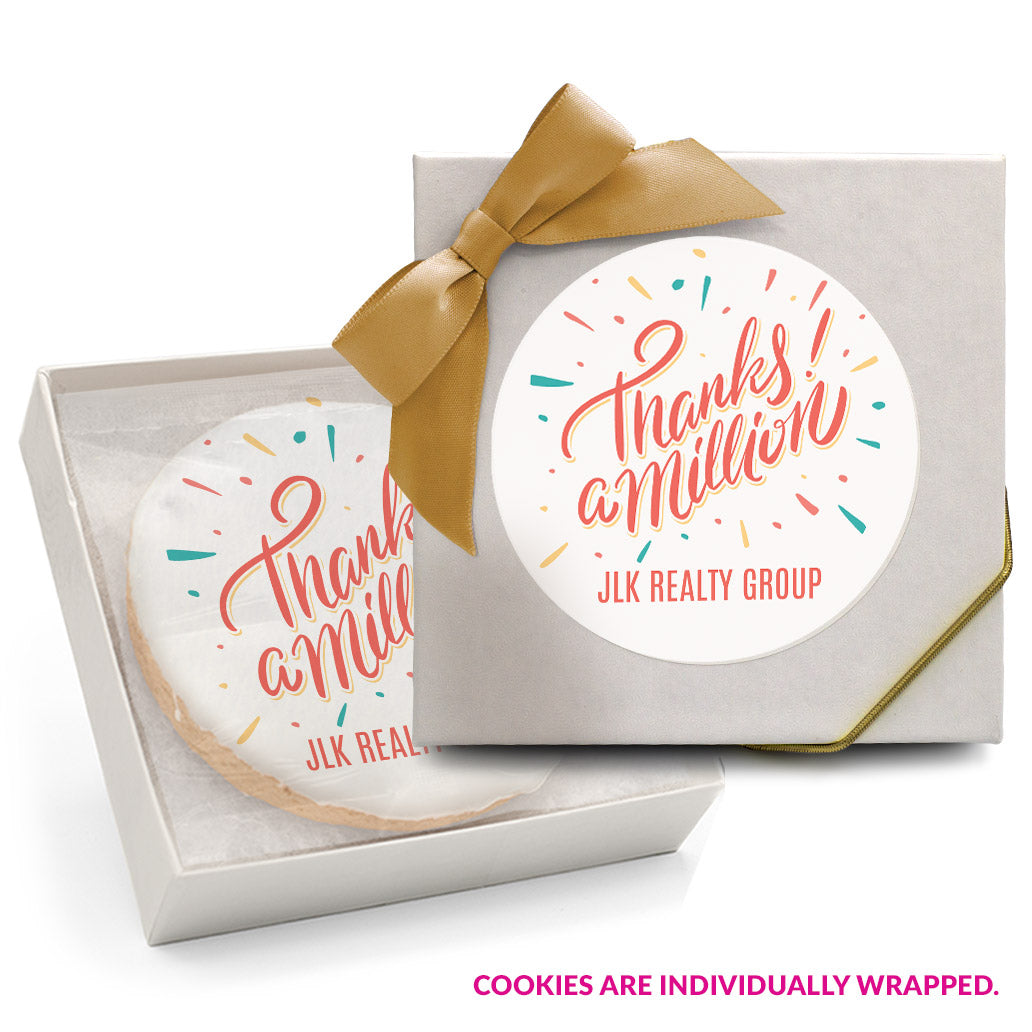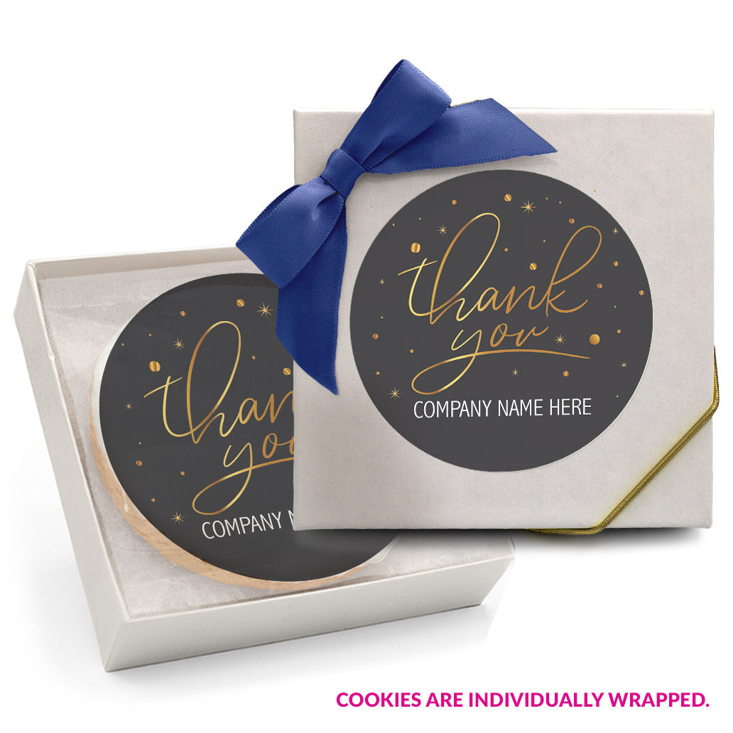 - Individually wrapped 2 oz. (3 inch) custom-printed sugar cookies.