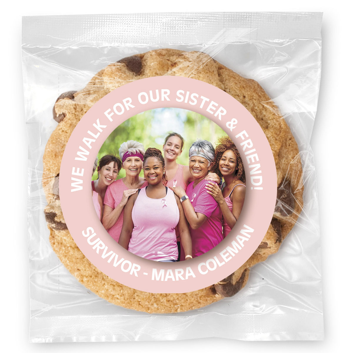 Our cookies with pink ribbon shaped stickers are ideal for breast cancer awareness month events. Available in both traditional sugar cookie format or in specialty flavors like Vegan Chocolate Chip or Gluten-Free Snickerdoodle. These awareness cookies make meaningful gifts that truly show your love and support while raising awareness.