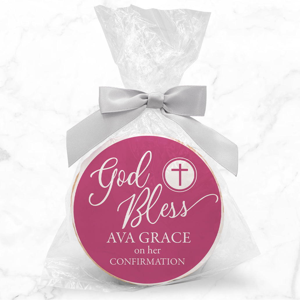 God Bless Simple Cross - Personalized Direct Print On Round Sugar Cookie w/ Gift Bag & Matching Bow