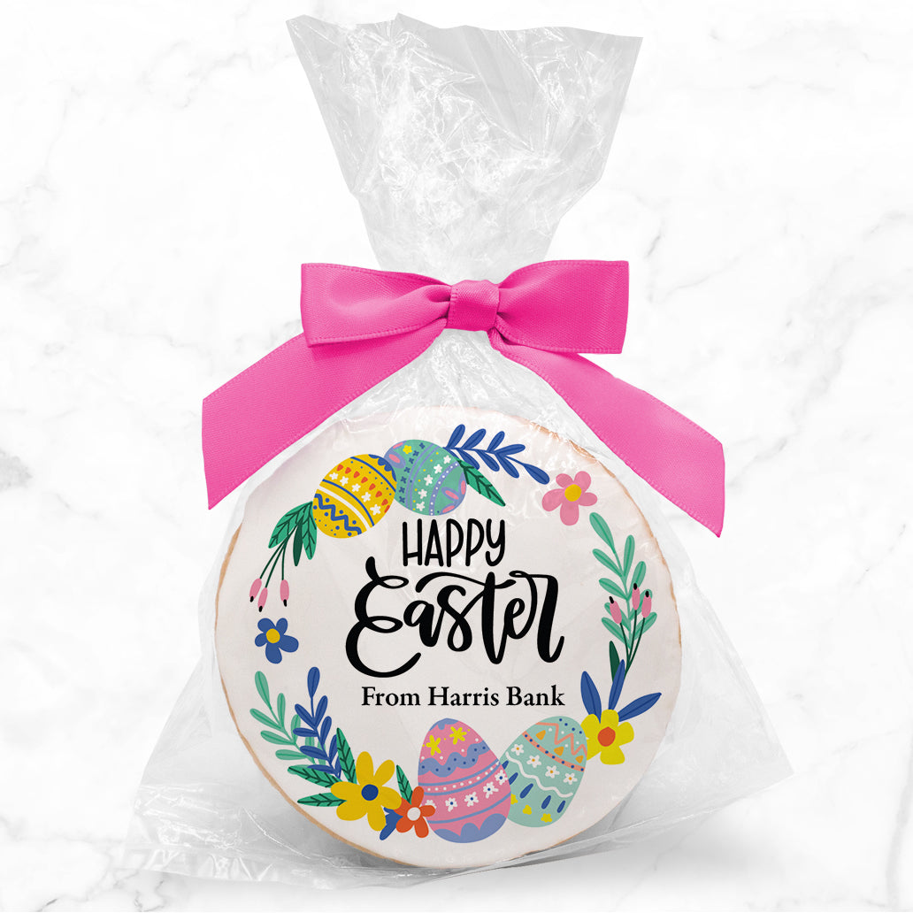 Happy Easter Colorful Wreath - Personalized Direct Print On Round Sugar Cookie w/ Gift Bag & Matching Bow