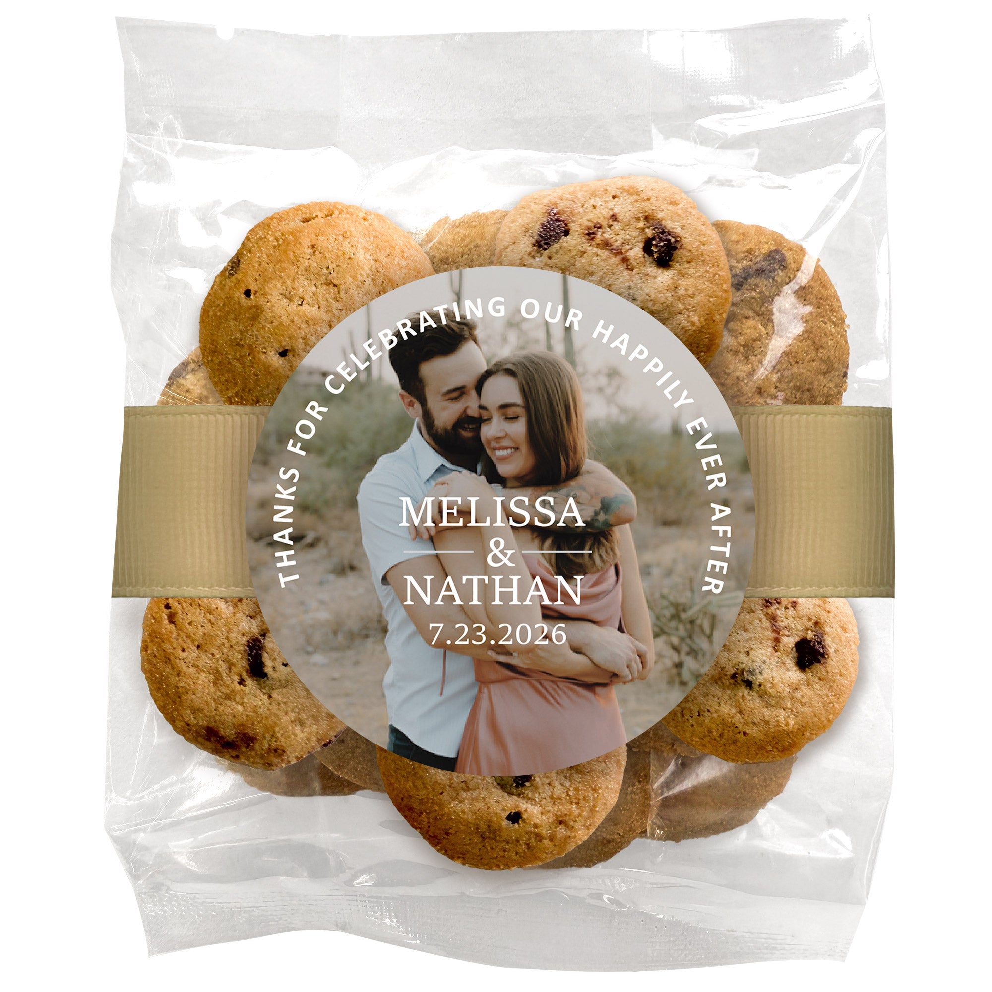 Bite-Sized Chocolate Chip Cookies (2 oz., approx. 16 cookies) W/ Full Color Custom Sticker & Ribbon- Happily ever after photo