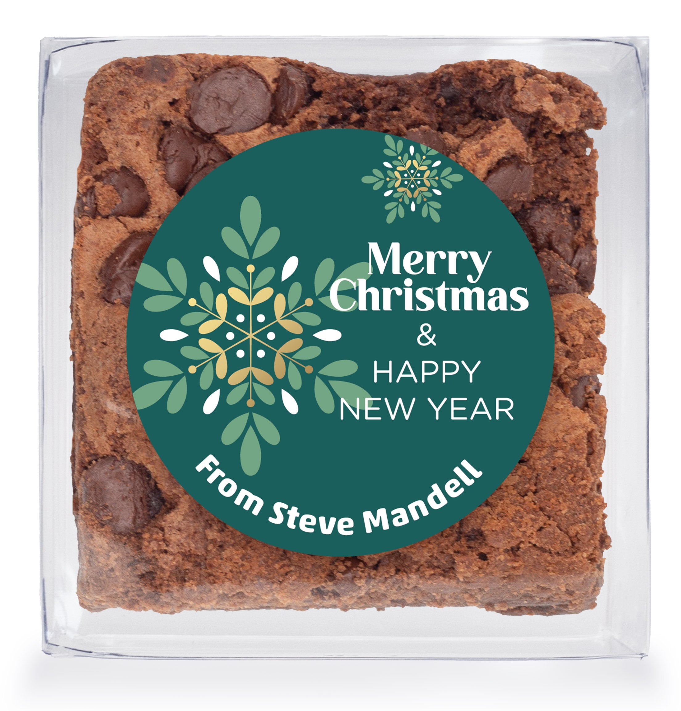 Merry Christmas & Happy New Year Snowflake - Chocolate Chip Fudge Brownies W/Full Color Personalized Sticker