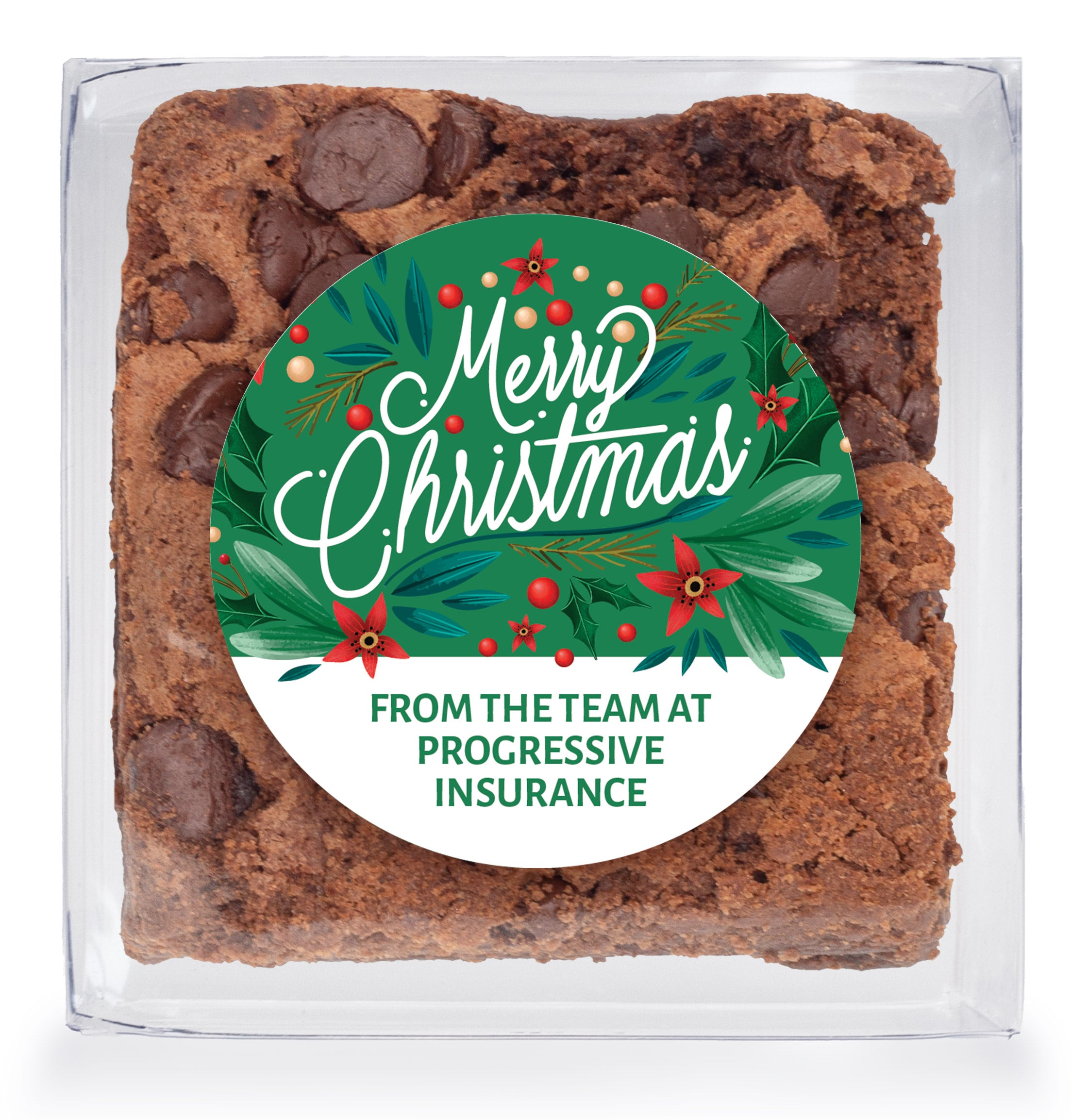 Merry Christmas Leaves and Poinsettias -Chocolate Chip Fudge Brownies W/Full Color Personalized Sticker