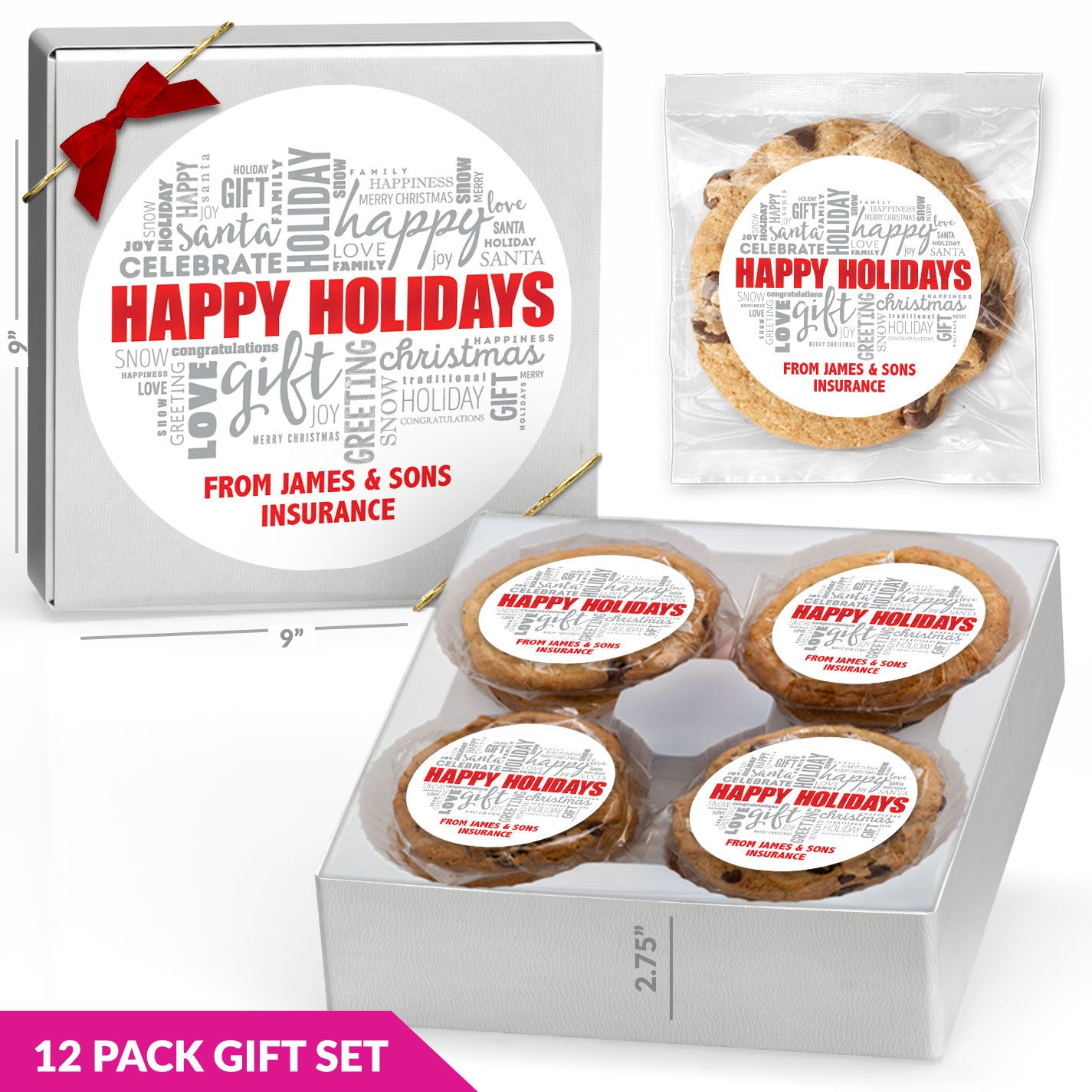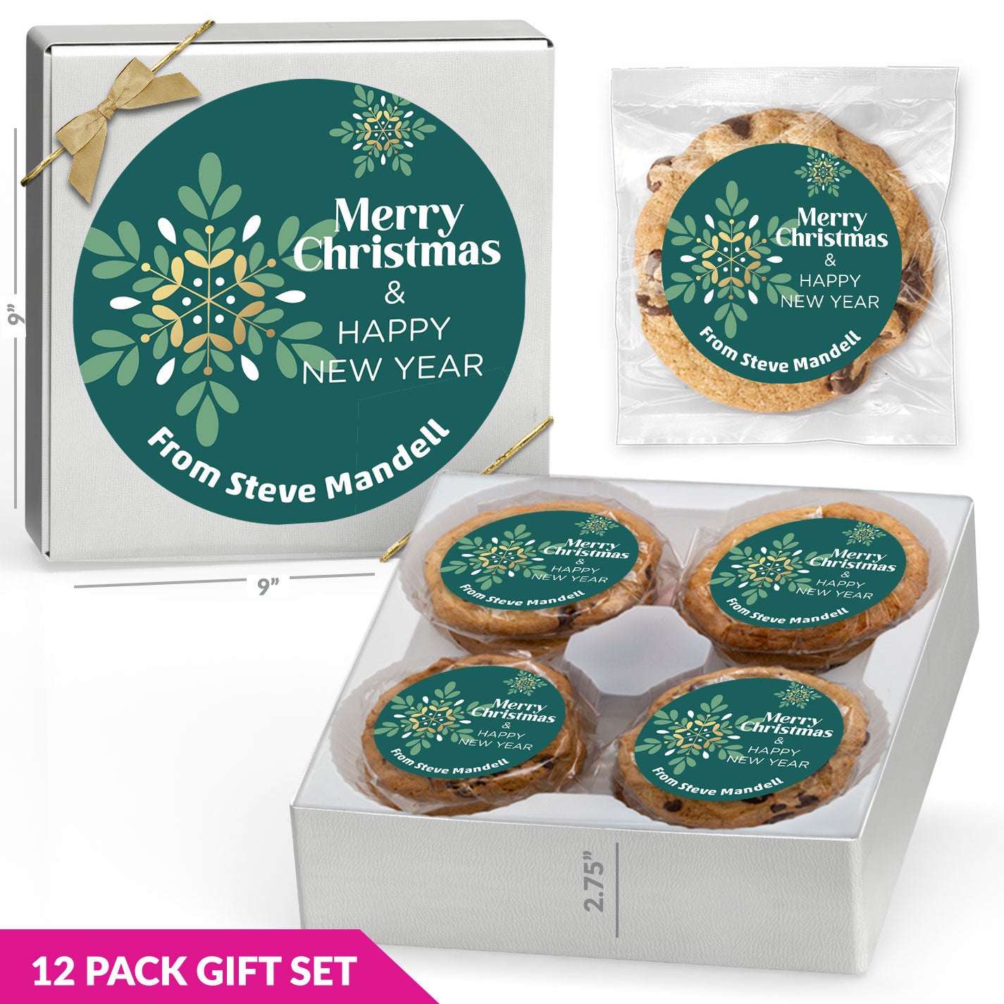 Spread holiday cheer with our delectable Christmas cookies, perfect for gifts, corporate events, and festive treats. Each cookie is individually wrapped and can be personalized with your favorite photo, logo, or special message. Shop our selection of gourmet cookie gifts featuring popular flavors like Chocolate Chip, Red Velvet, and S'mores, all available in custom holiday designs. For those with dietary needs, we offer gluten-free and vegan options too!