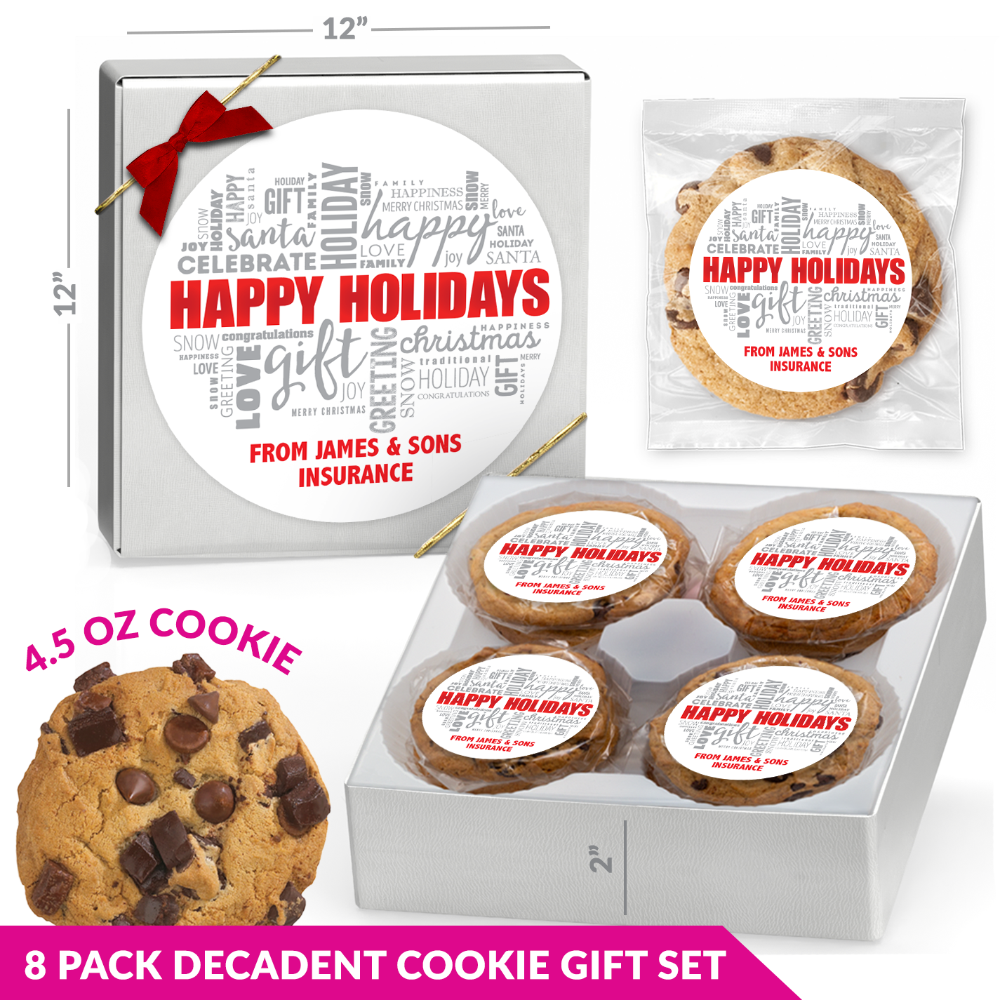 Happy Holidays Logo Upload - Gourmet Chocolate Chip or Variety Pack w/ Full Color Personalized Sticker Gift Box