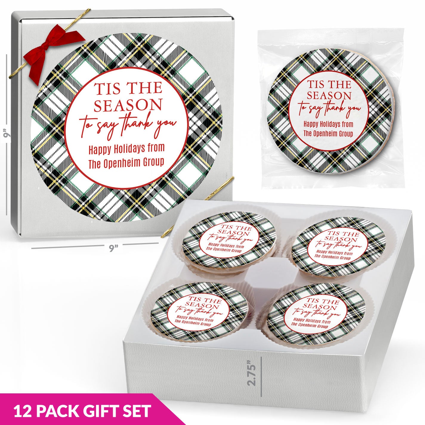 - 12- Individually wrapped custom-printed sugar cookies.