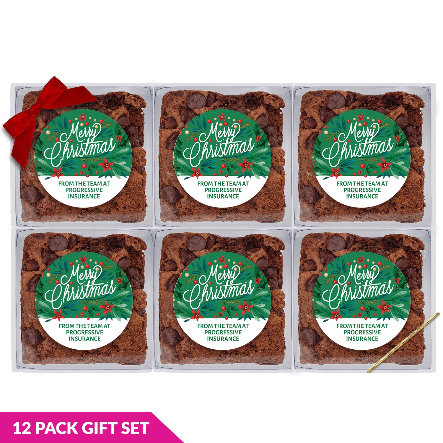 Merry Christmas Leaves and Poinsettias - Chocolate Chip Fudge Brownies W/Full Color Personalized Sticker Gift Set