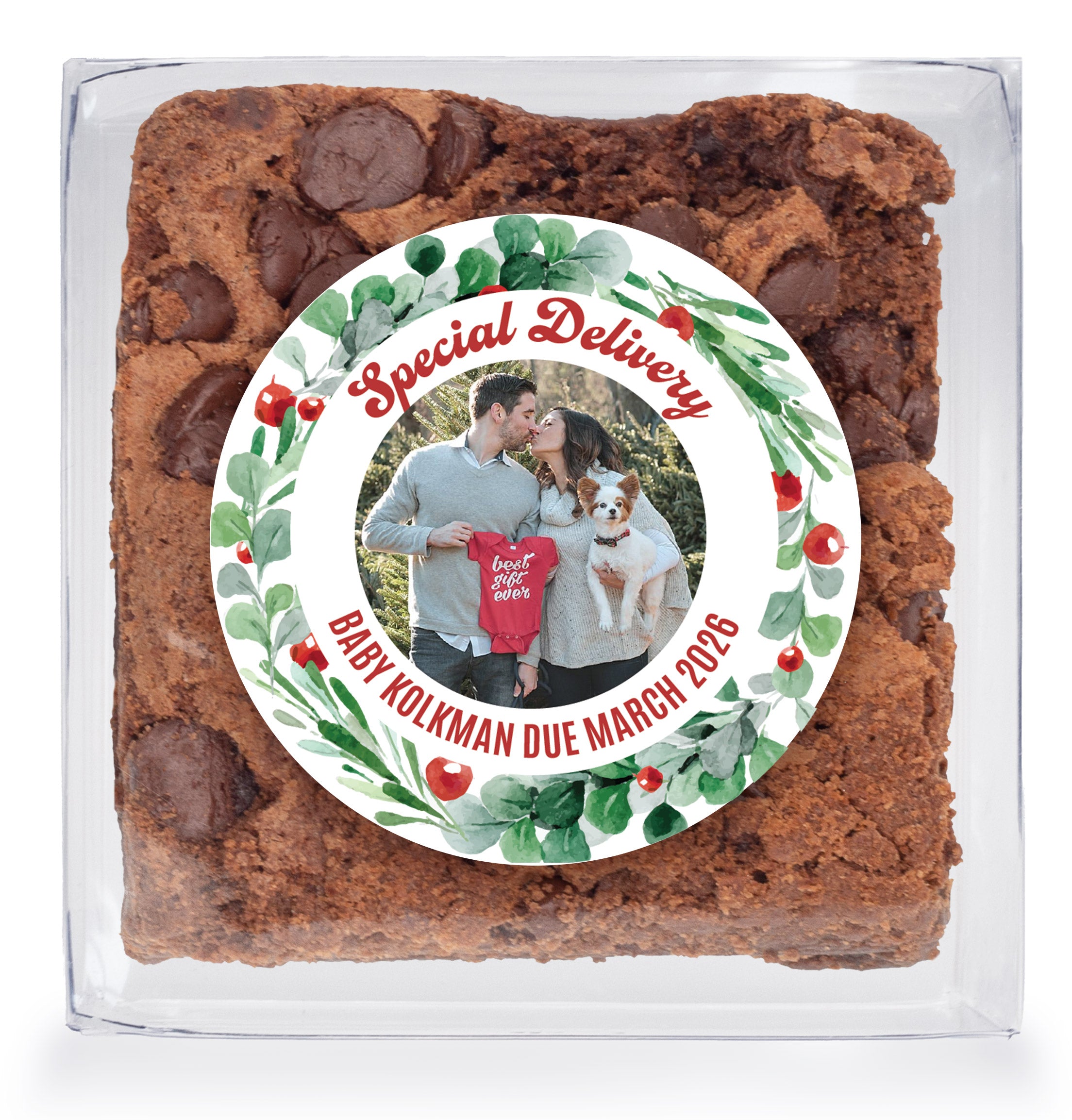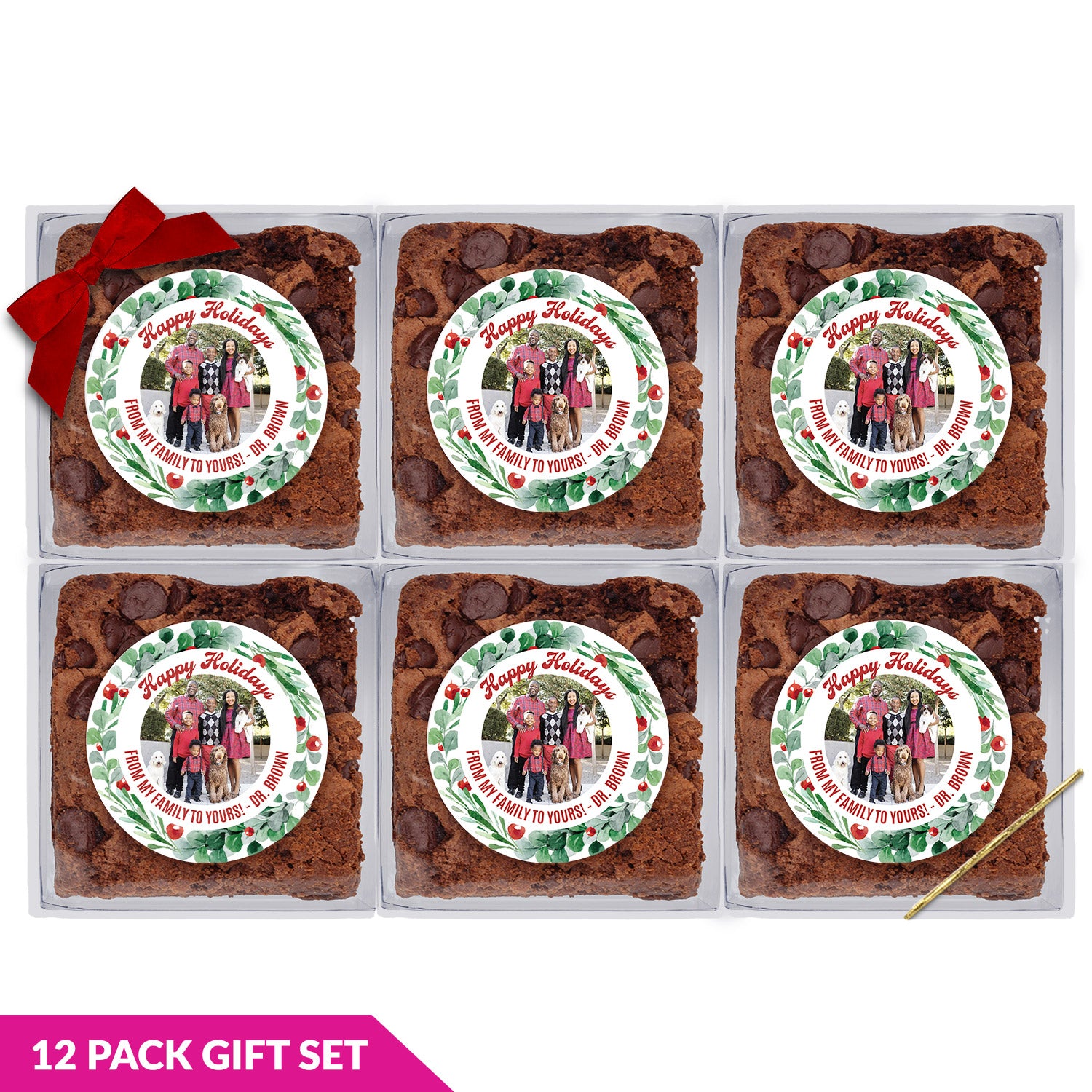Wreath & Message Photo Upload - Chocolate Chip Fudge Brownies W/Full Color Personalized Sticker Gift Set