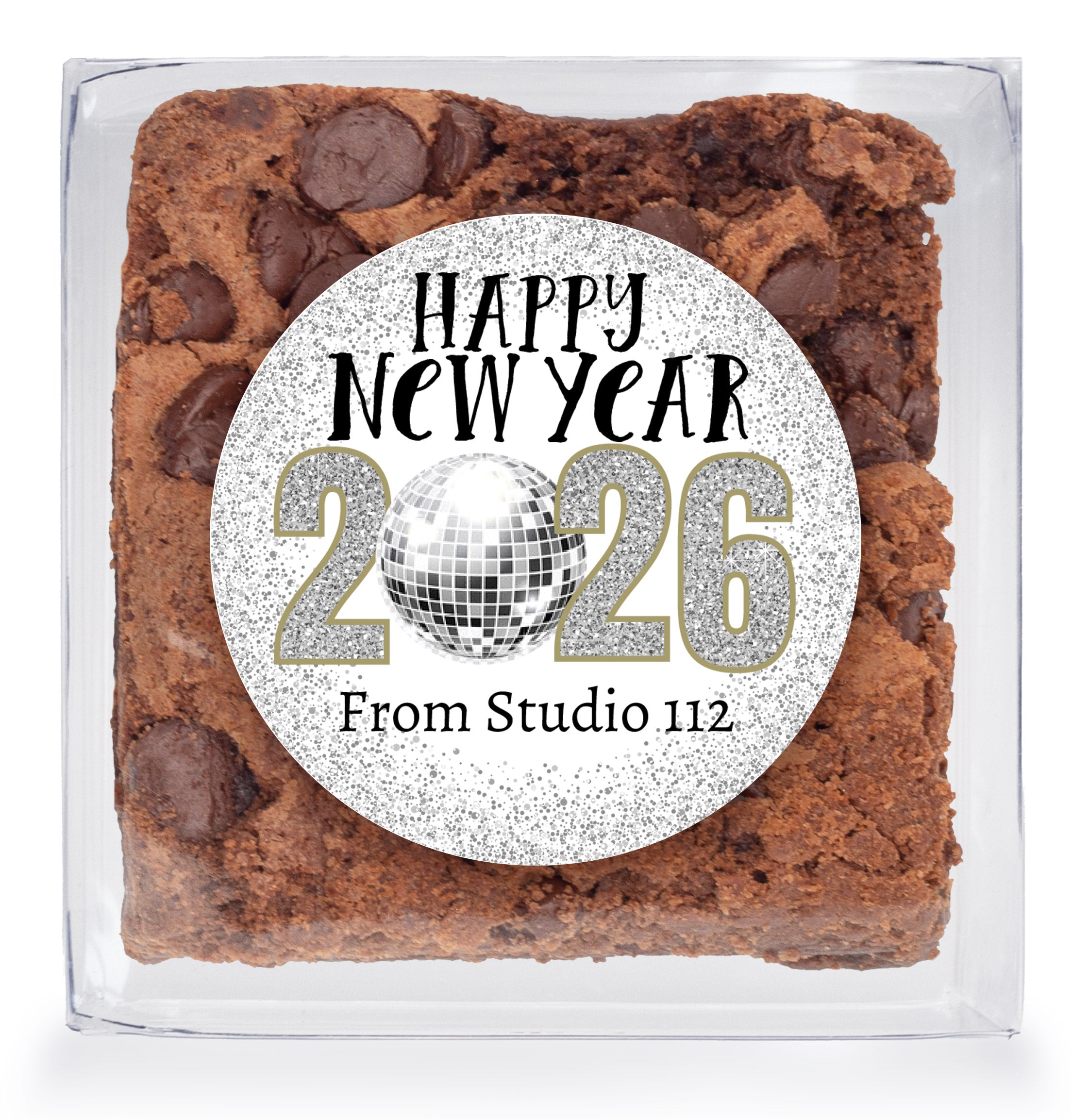 Happy New Year Silver Ball Drop - Chocolate Chip Fudge Brownies W/Full Color Personalized Sticker