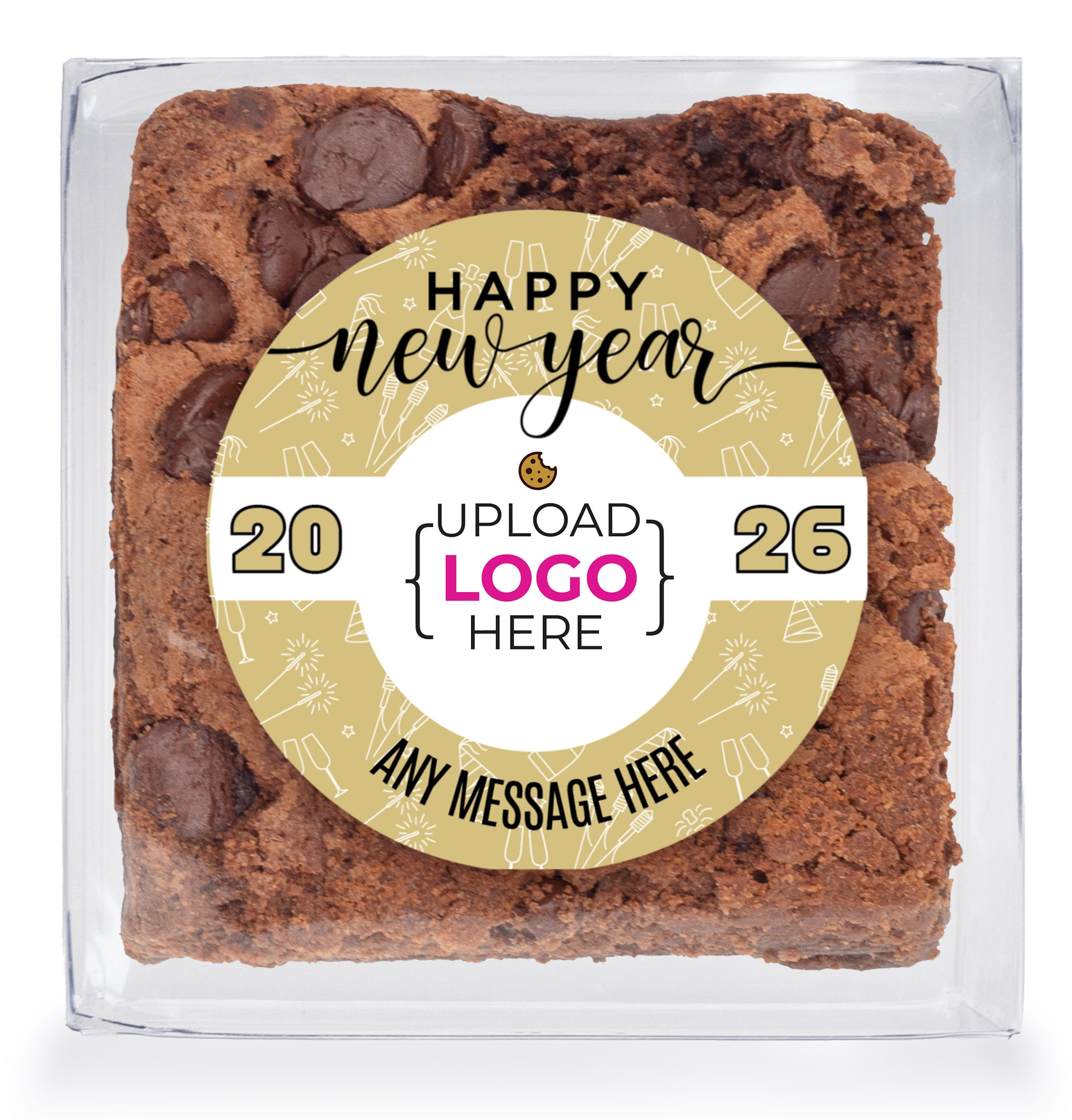 NYE 2026 Logo Upload & Message - Chocolate Chip Fudge Brownies W/Full Color Personalized Sticker