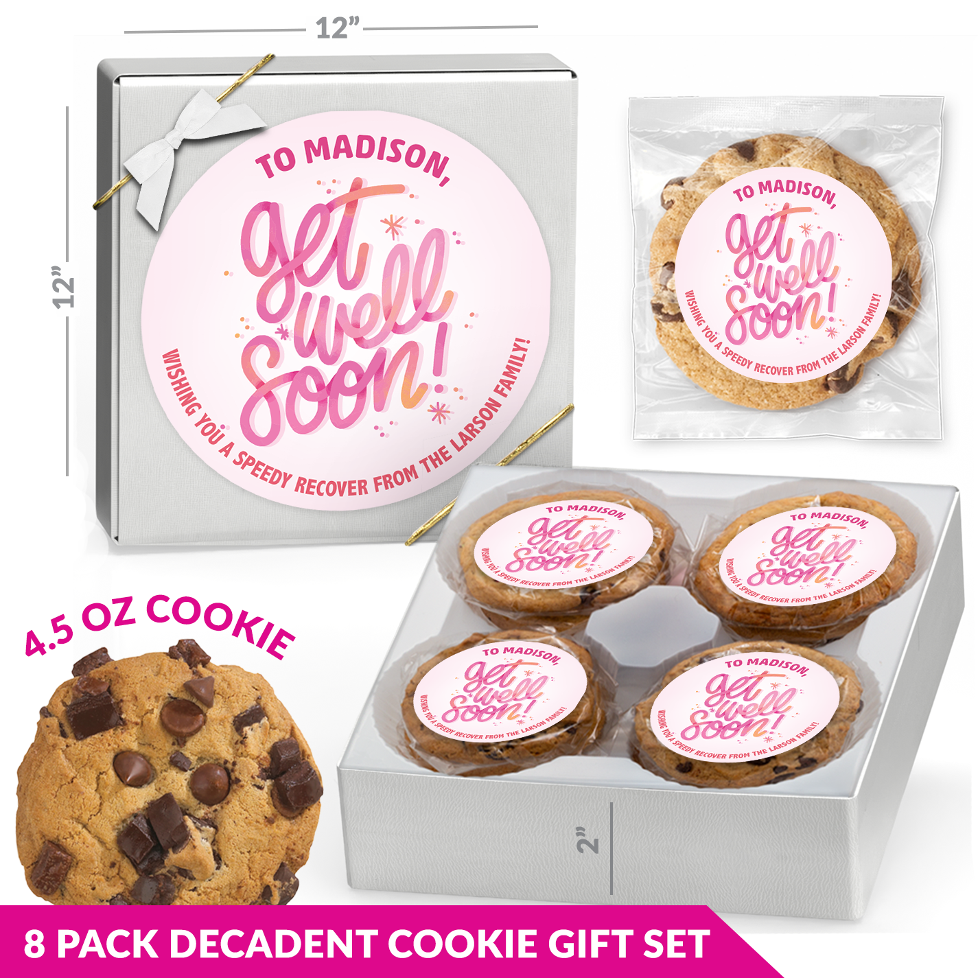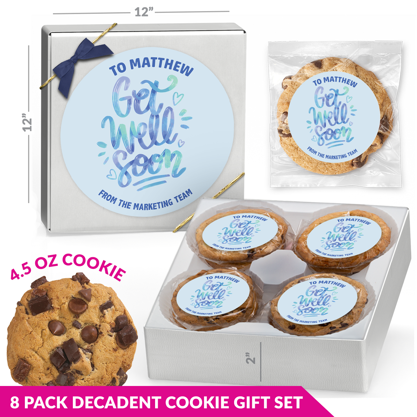 Get Well Soon Message & Color Choice - Custom Decadent Cookie 8-Pack Gift Set w/ Full Color Personalized Sticker