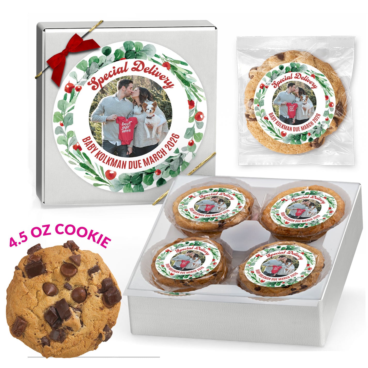 - 8 Individually Wrapped 4.5 oz. Custom Decadent Cookies.
