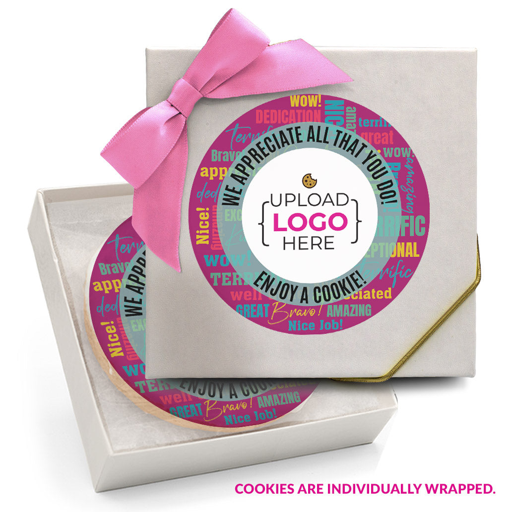 Write your own Appreciation Words Logo Upload - Personalized Direct Print On Round Sugar Cookie w/ Matching Personalized Favor Box, Sticker & Bow Choice