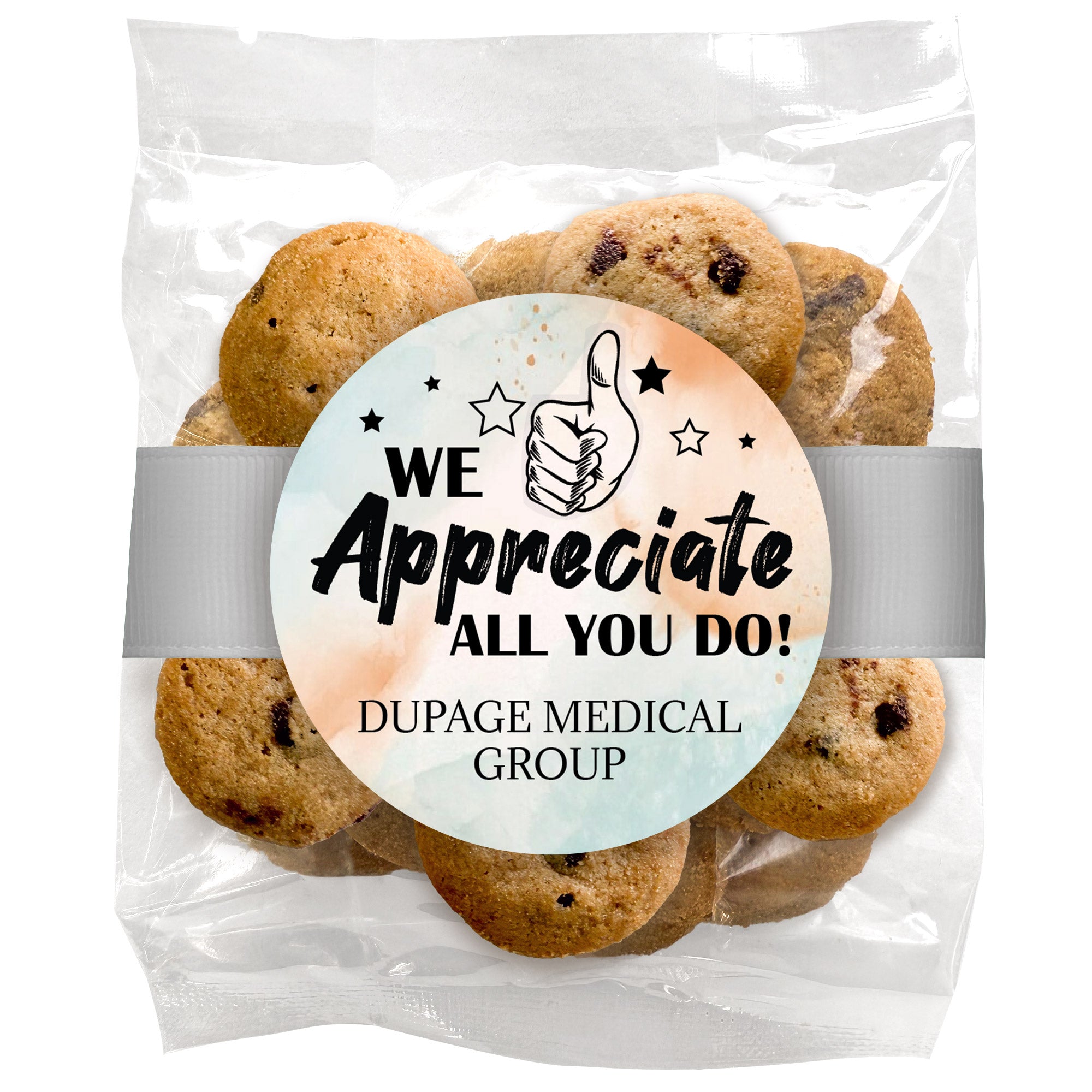 Bite-Sized Chocolate Chip Cookies (2 oz., approx. 14 cookies) W/ Full Color Custom Sticker & Ribbon - Appreciate Thumbs Up