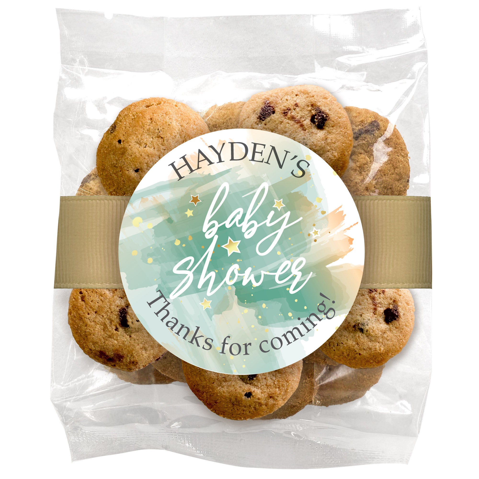 Watercolor Stars Baby Shower - Chocolate Chip Mini Cookies (2 oz) W/ Full Color Custom Sticker & Ribbon