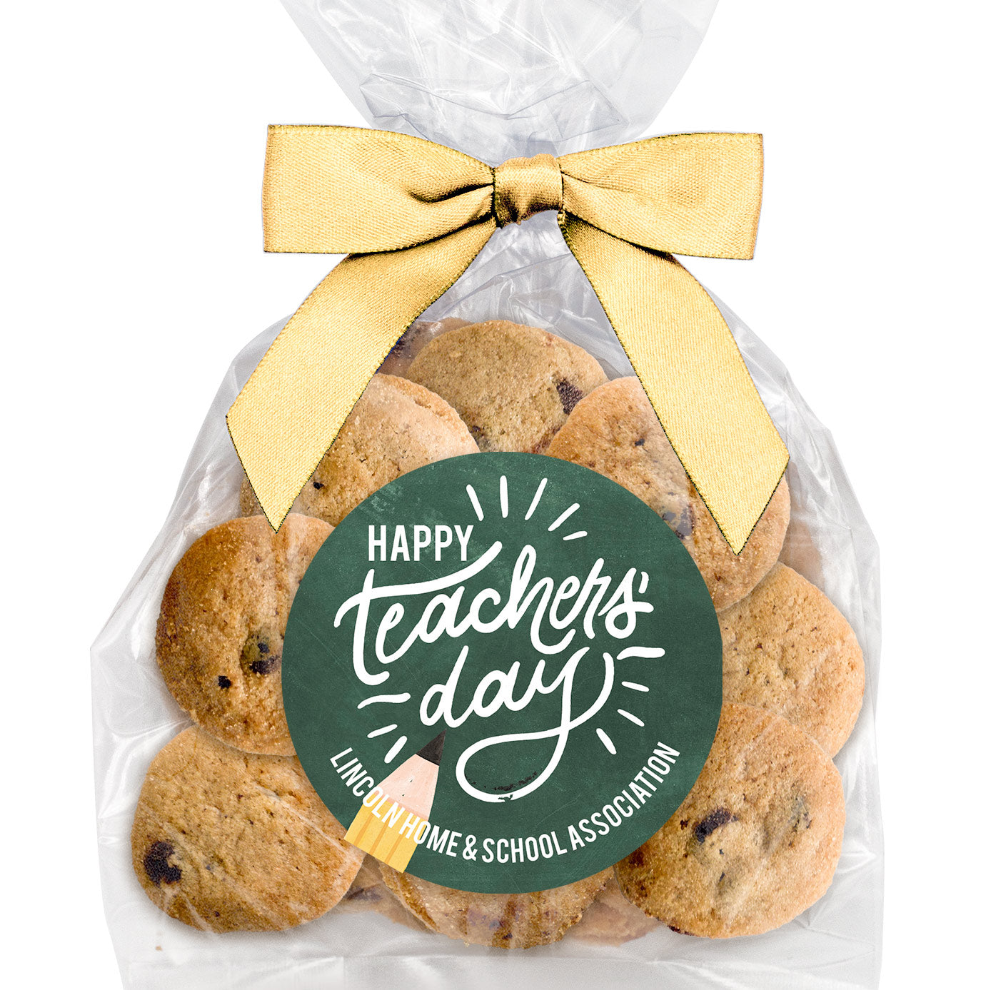 Happy Teachers Day Chalk Board - Chocolate Chip Mini Cookies (3 oz) W/ Full Color Custom Sticker & Bow Choice