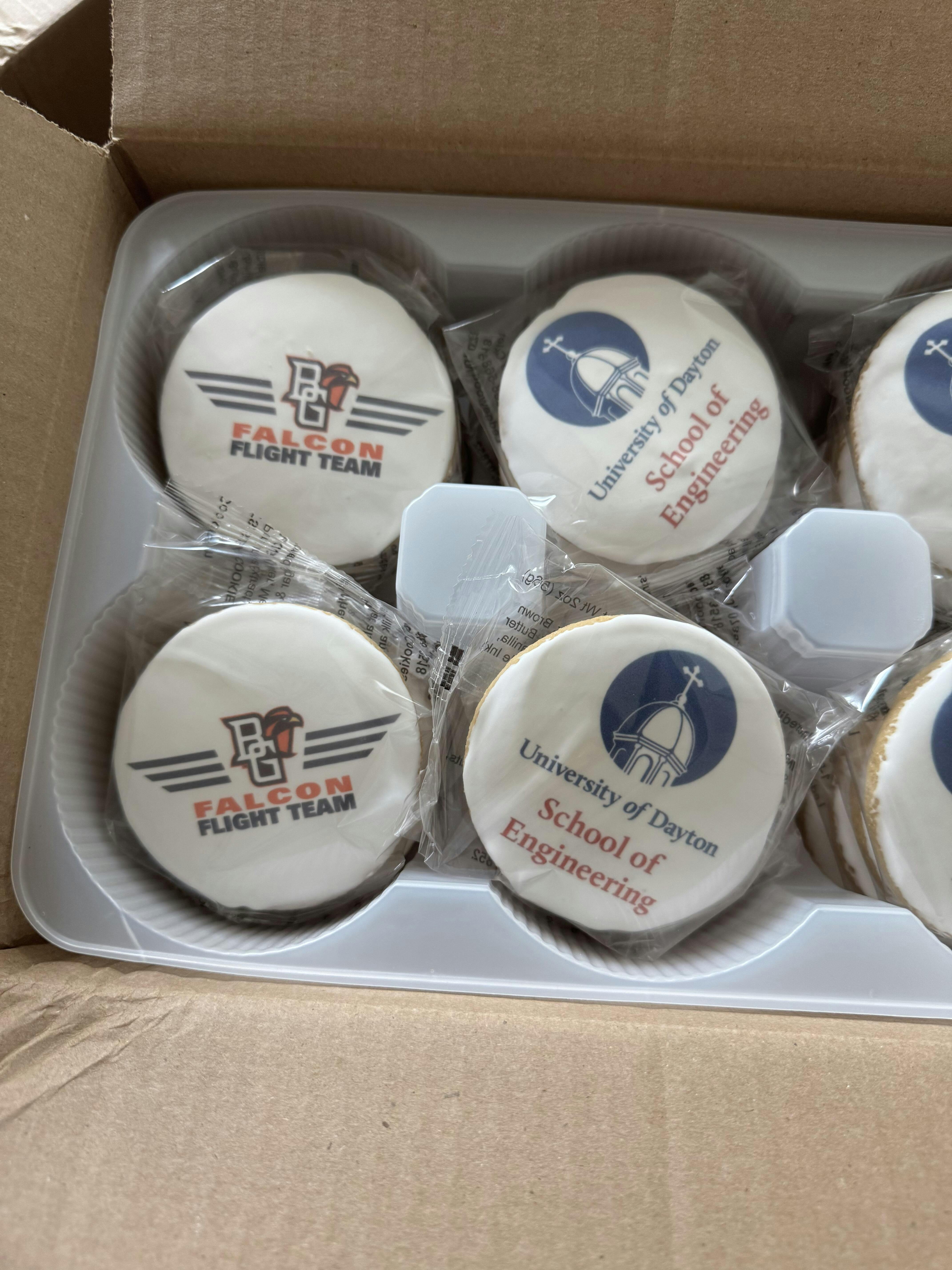 - Individually wrapped 2 oz. (3 inch) custom-printed sugar cookies.