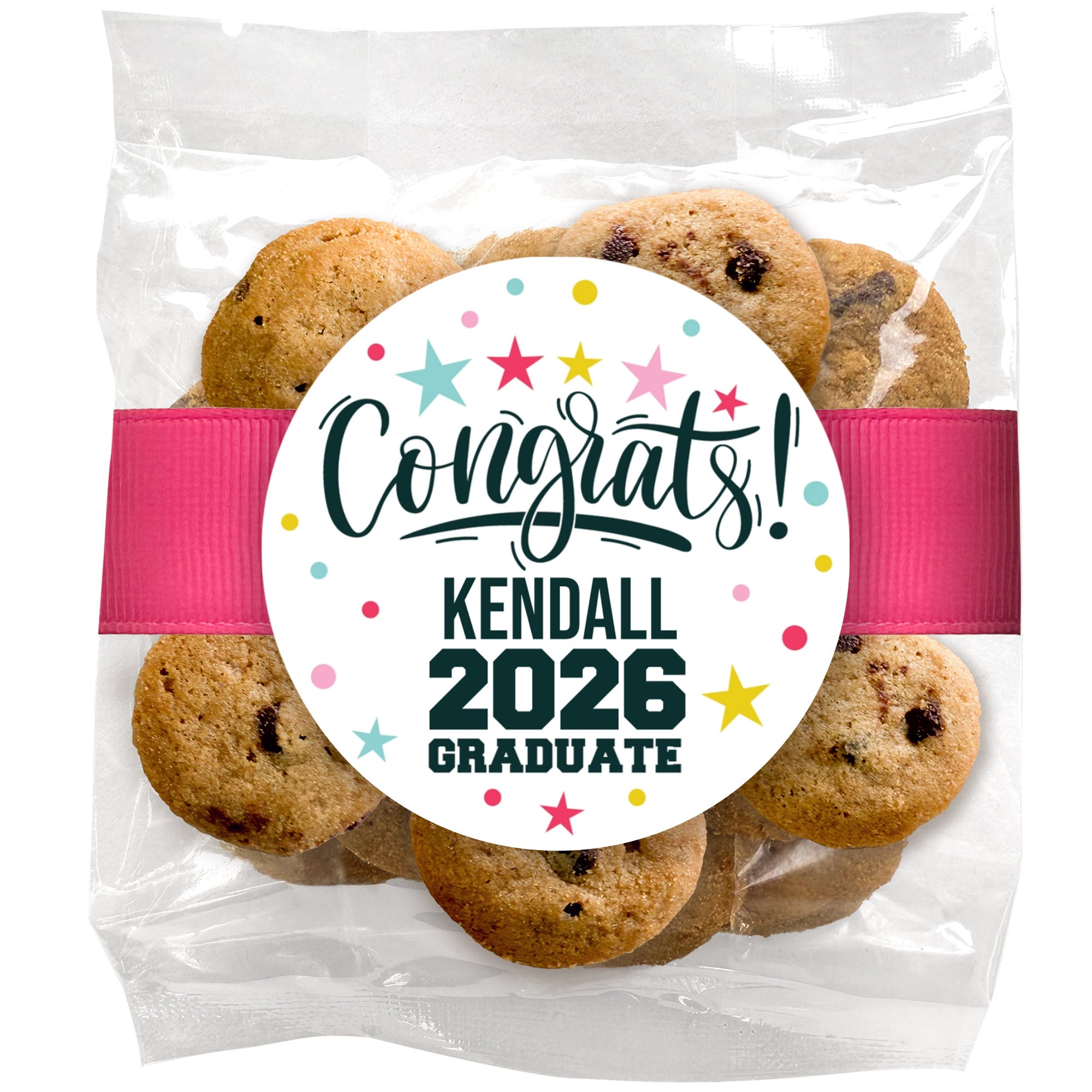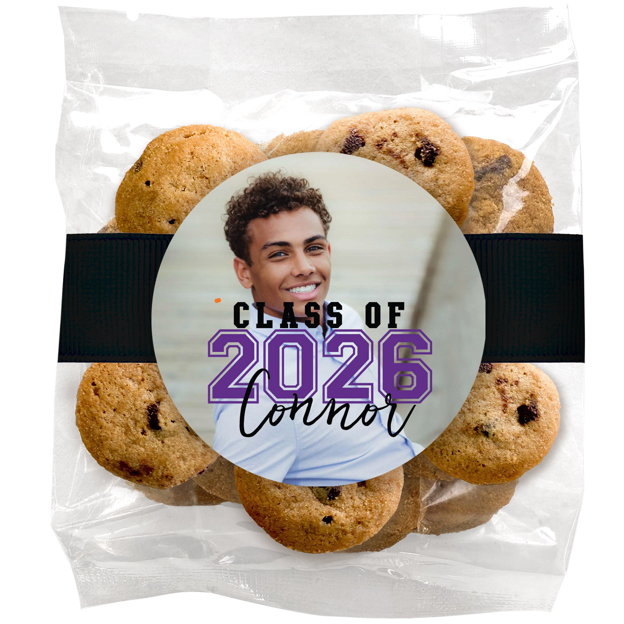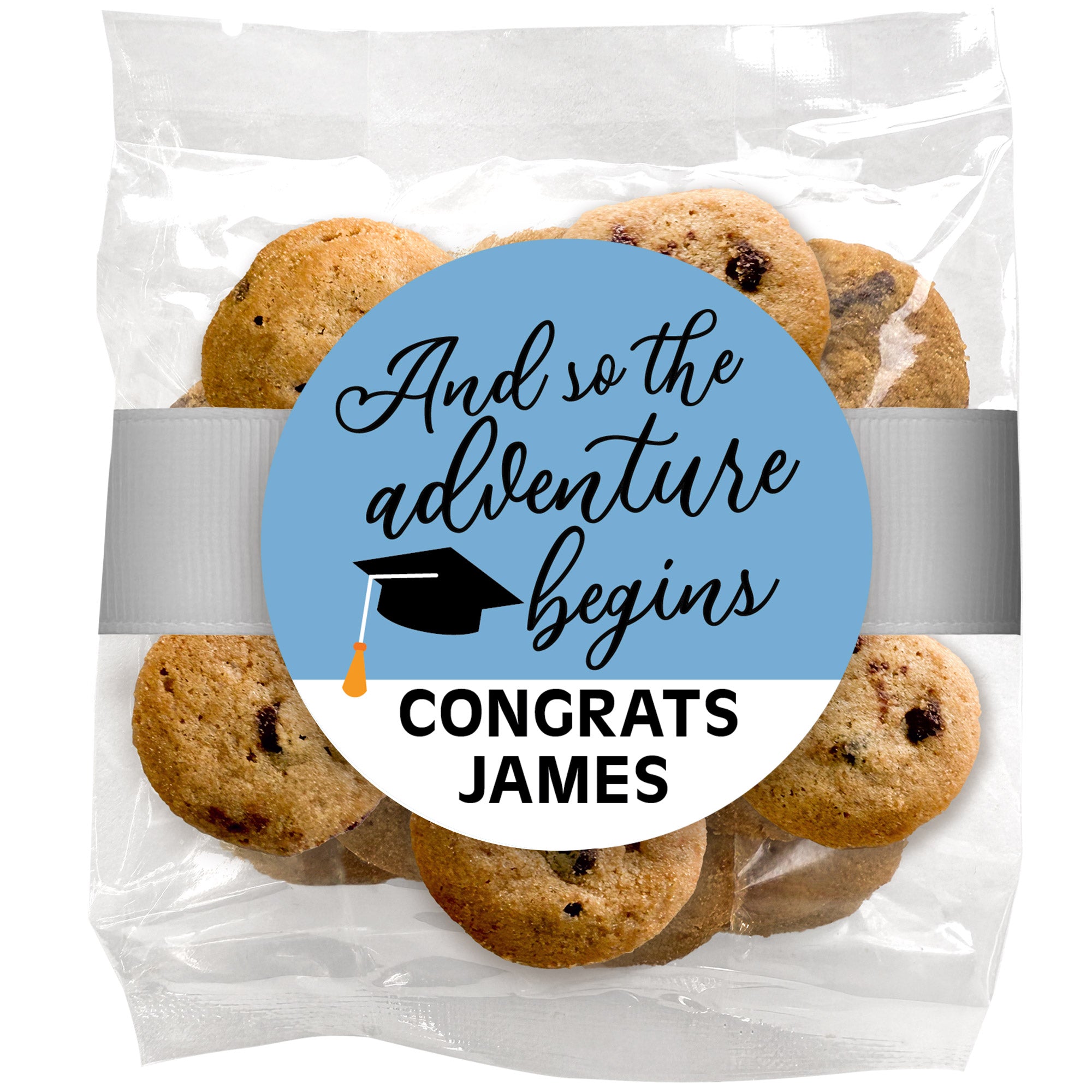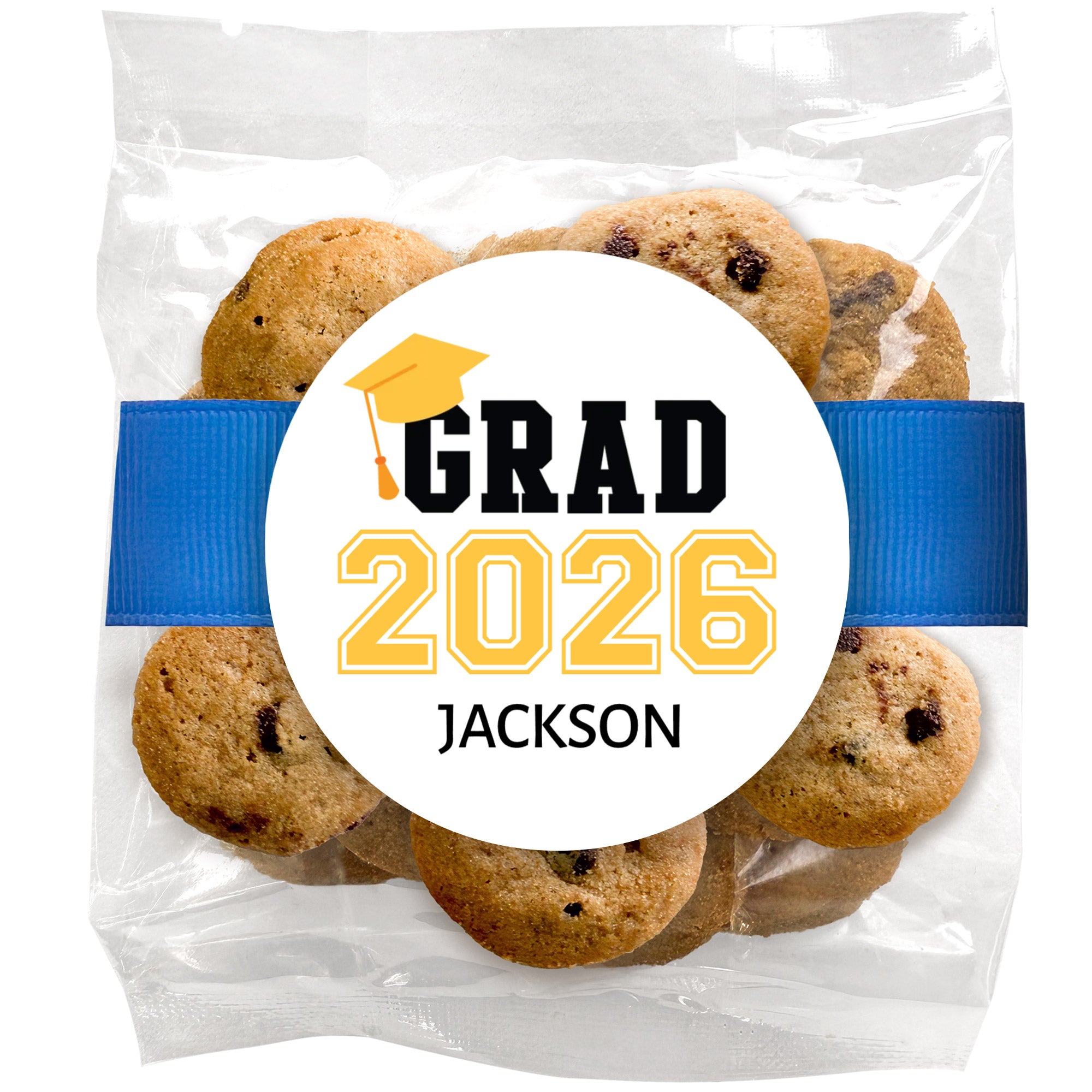 Mini chocolate chip graduation cookies are perfect for larger gatherings and easy sharing. Packaged together in a convenient bag, they make grab-and-go treats that guests of all ages can enjoy throughout the celebration.