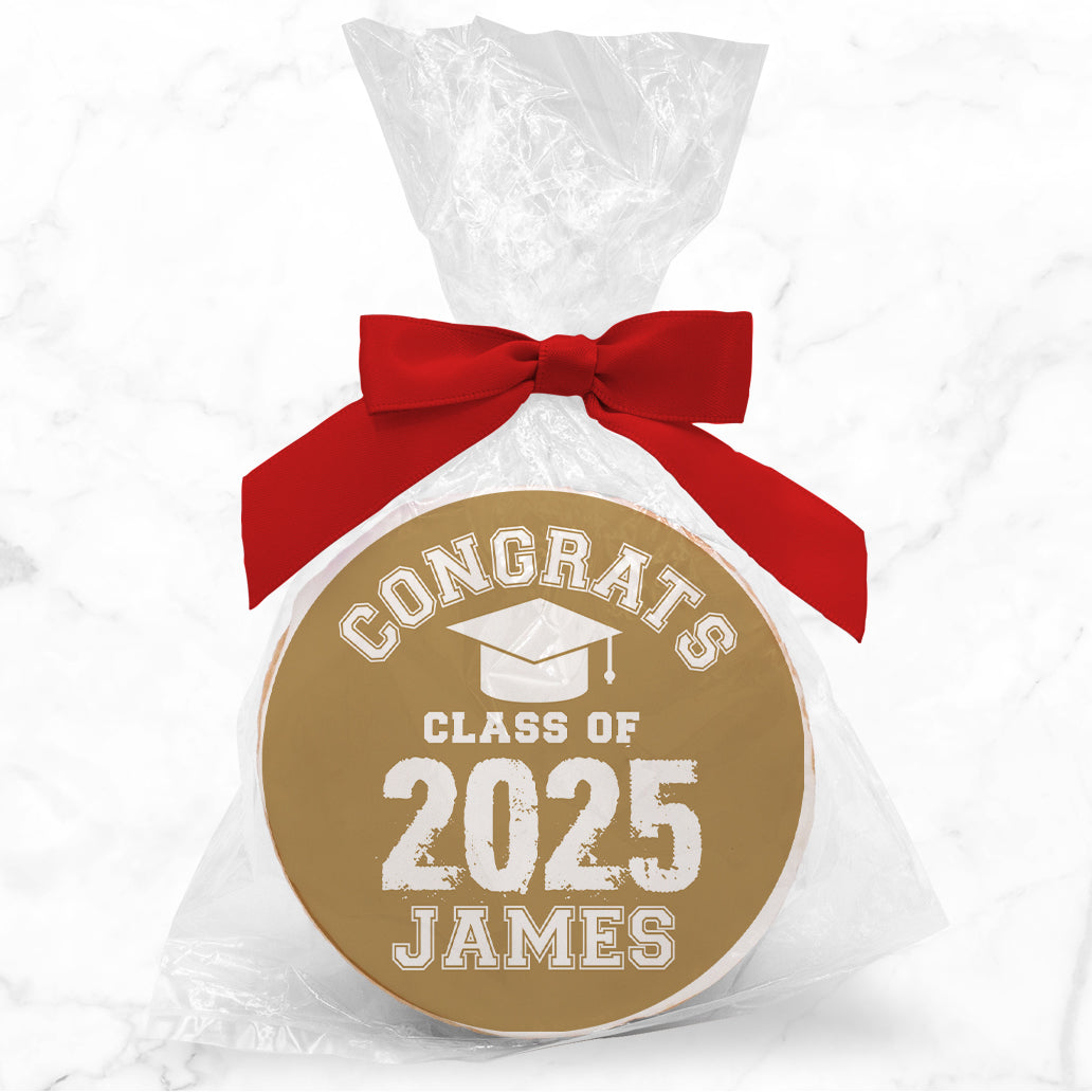 Celebrate your graduate with a round sugar cookie printed with “Congrats Class of” in your choice of colors. Each cookie comes with a gift bag and matching bow, making it a fun, personalized treat for graduation parties, school events, or sharing with friends and family.
