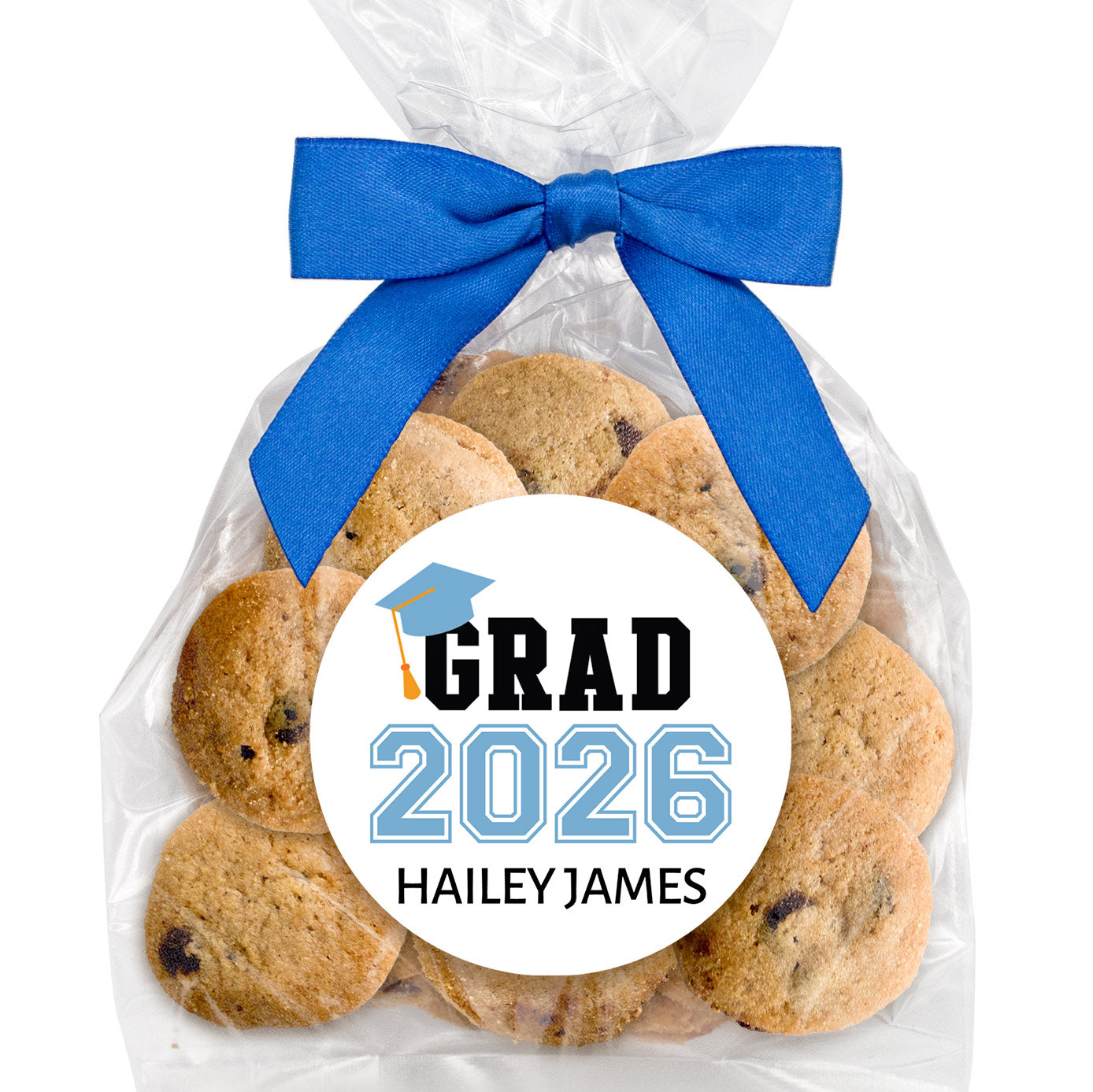 Grad Year & Cap - Chocolate Chip Mini Cookies (3 oz) W/ Full Color Custom Sticker & Bow Choice