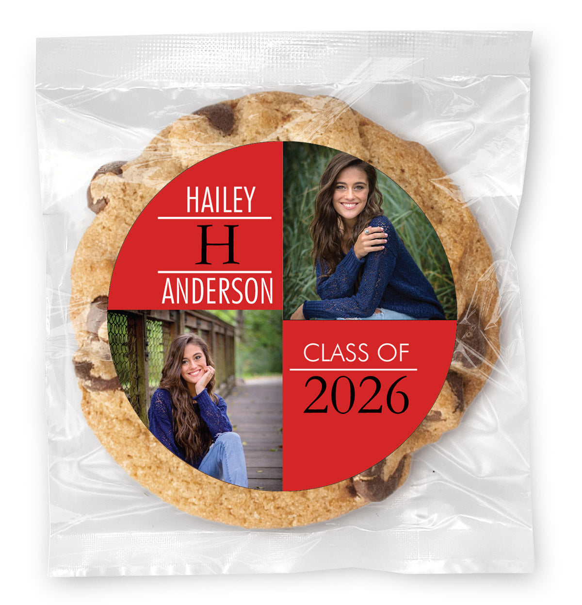 Make graduation extra memorable with a chocolate chip or assorted flavor gourmet cookie featuring a full-color sticker with two custom photos. Perfect for parties, school events, or gifting to friends and family to celebrate your graduate.