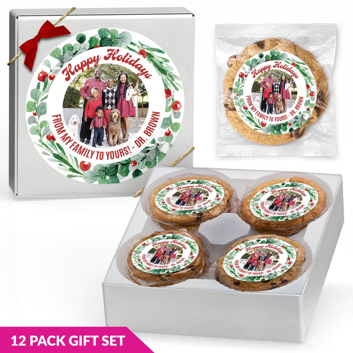 Wreath & Message Photo Upload - Gourmet Chocolate Chip or Variety Pack w/ Full Color Personalized Sticker Gift Set