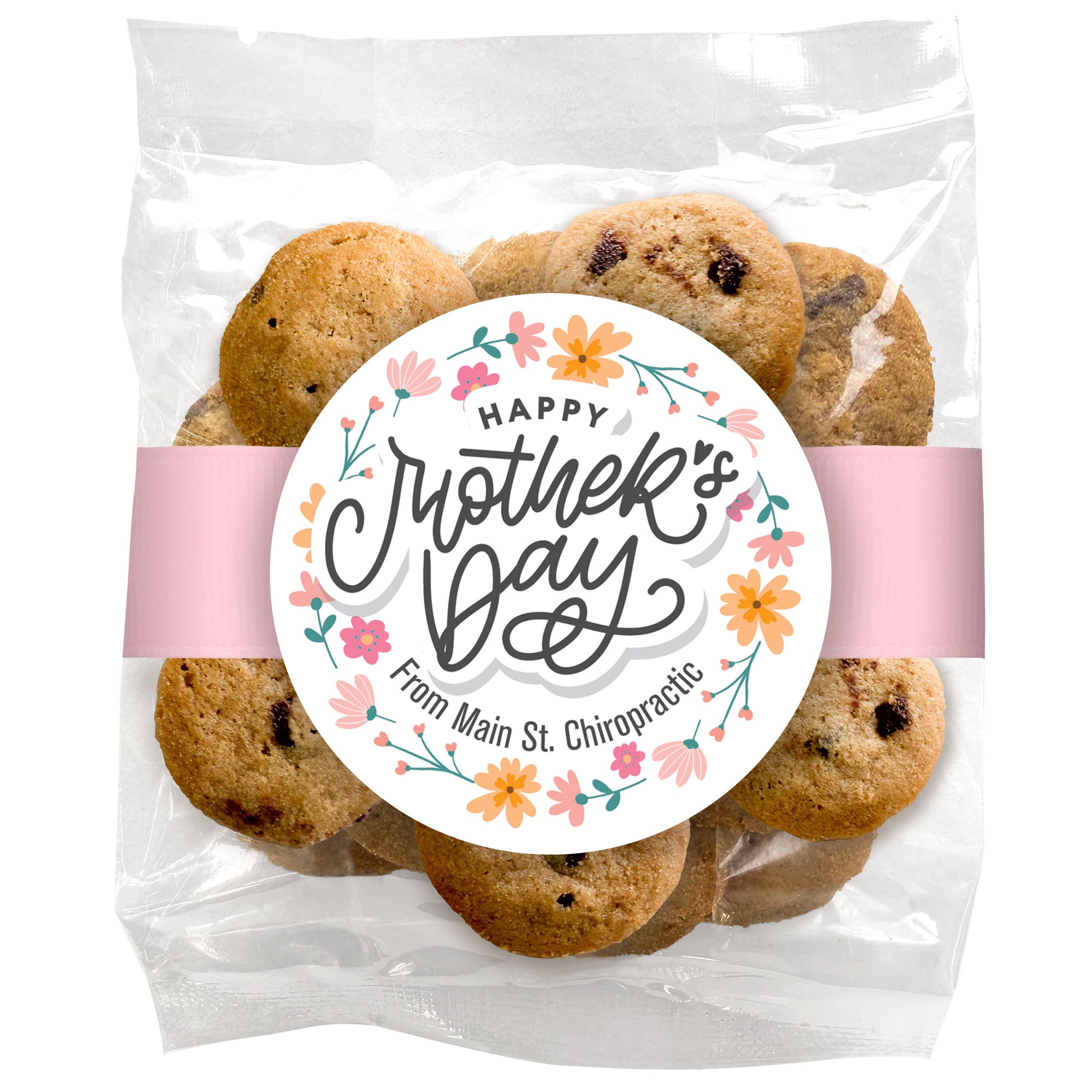 - Mini Chocolate Chip Cookies: Available in 2 oz and 3 oz bags with a full color custom sticker and ribbon. A great option for larger events, trade shows, or handing out to a team. Starting at $1.88 each.