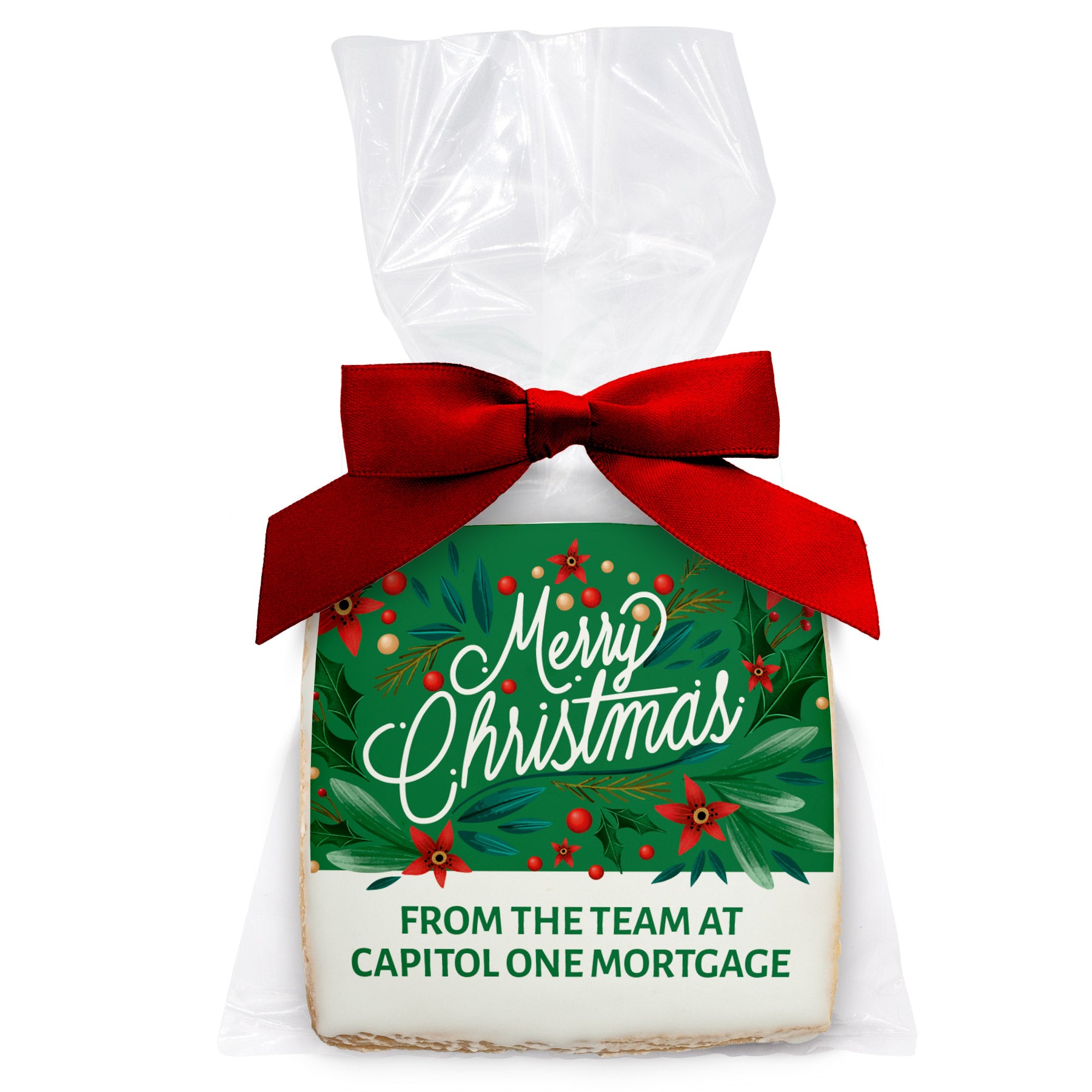 Merry Christmas Leaves and Poinsettias - Personalized Direct Print On Square Sugar Cookie w/ Gift Bag & Matching Bow