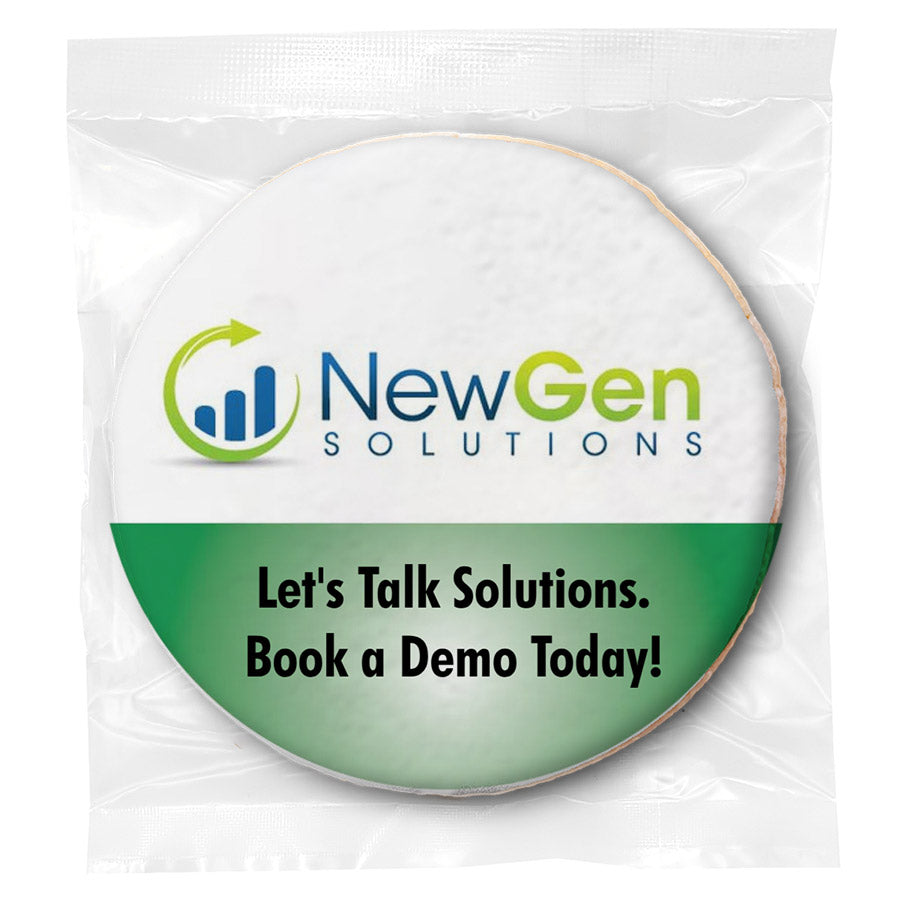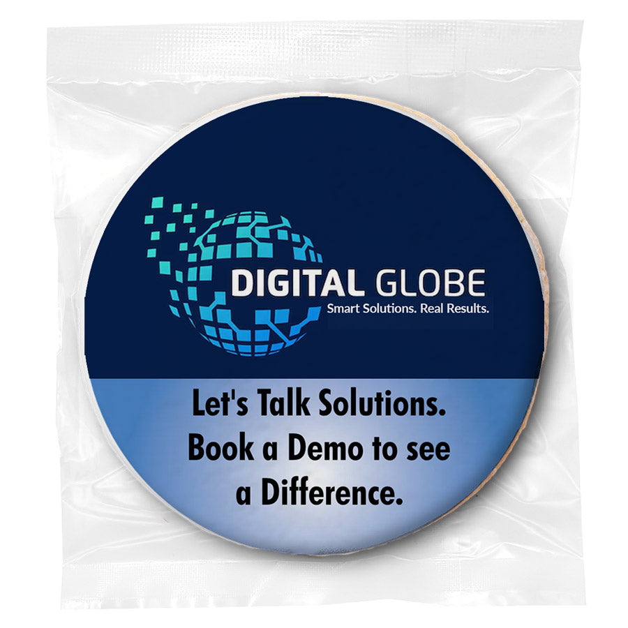 - Individually wrapped 2 oz. (3 inch) custom-printed sugar cookies.
