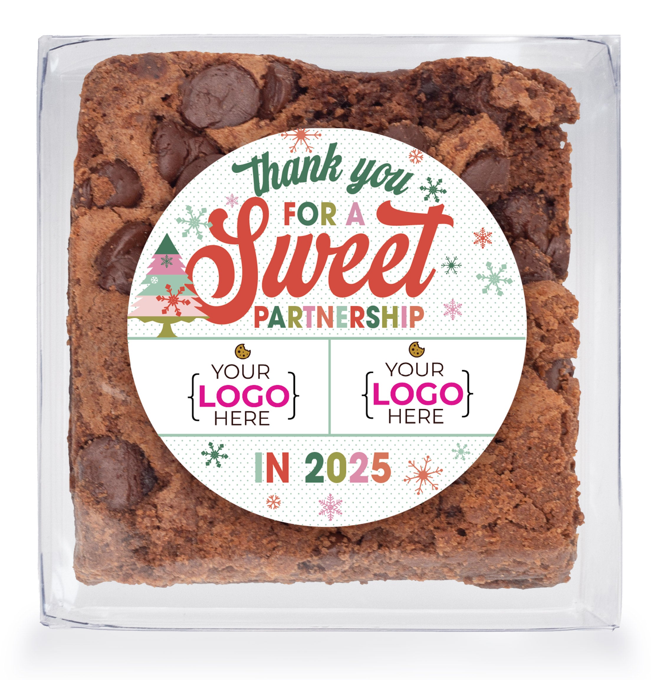 A Sweet Partnership Holiday Logo Upload - Chocolate Chip Fudge Brownies W/Full Color Personalized Sticker