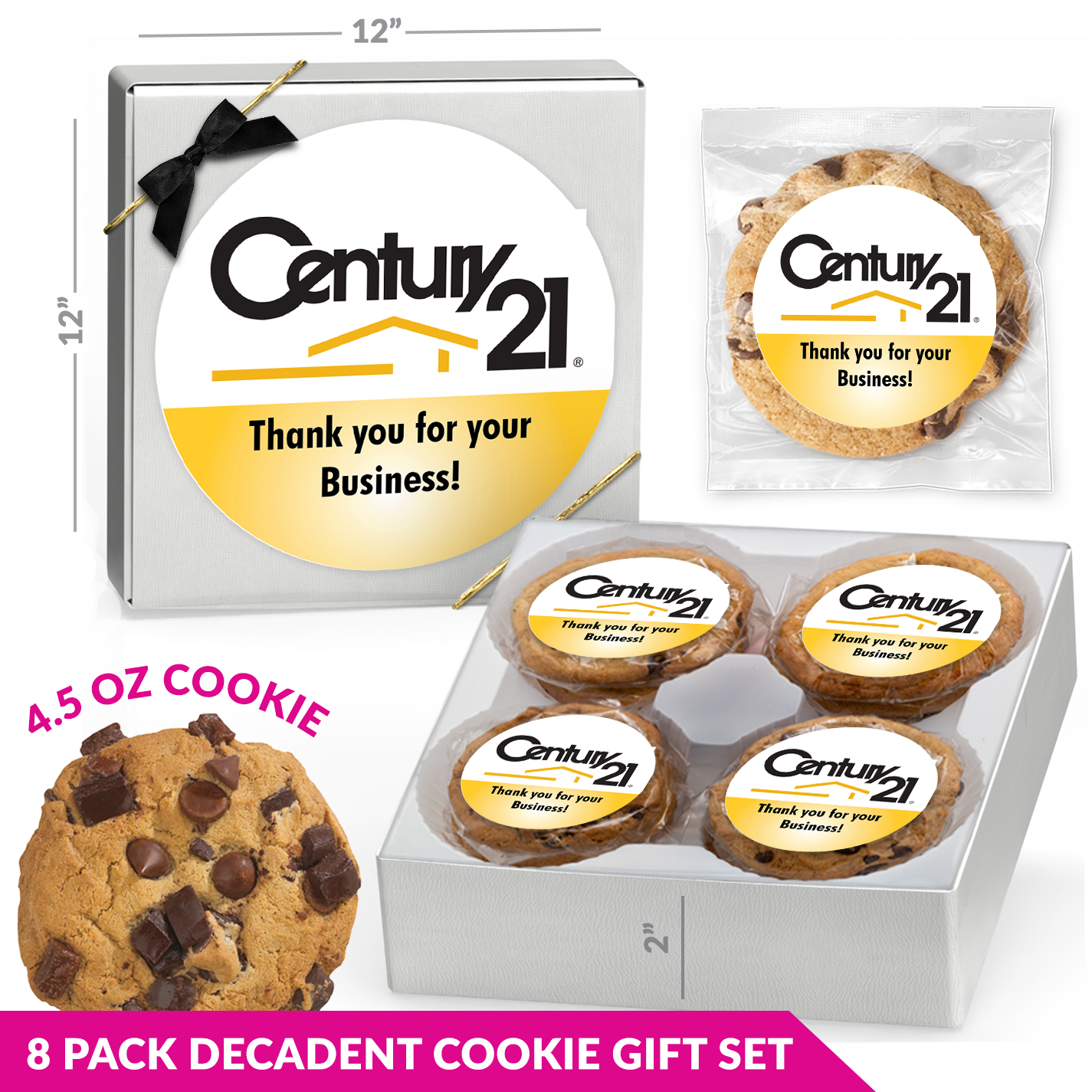- 8 Individually Wrapped 4.5 oz. Custom Decadent Cookies.