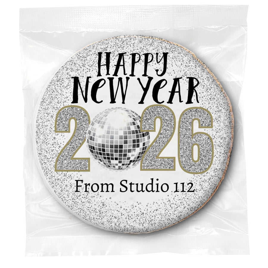 Happy New Year Silver Ball Drop - Gourmet Chocolate Chip Or Variety Pack W/ Full Color Personalized Sticker