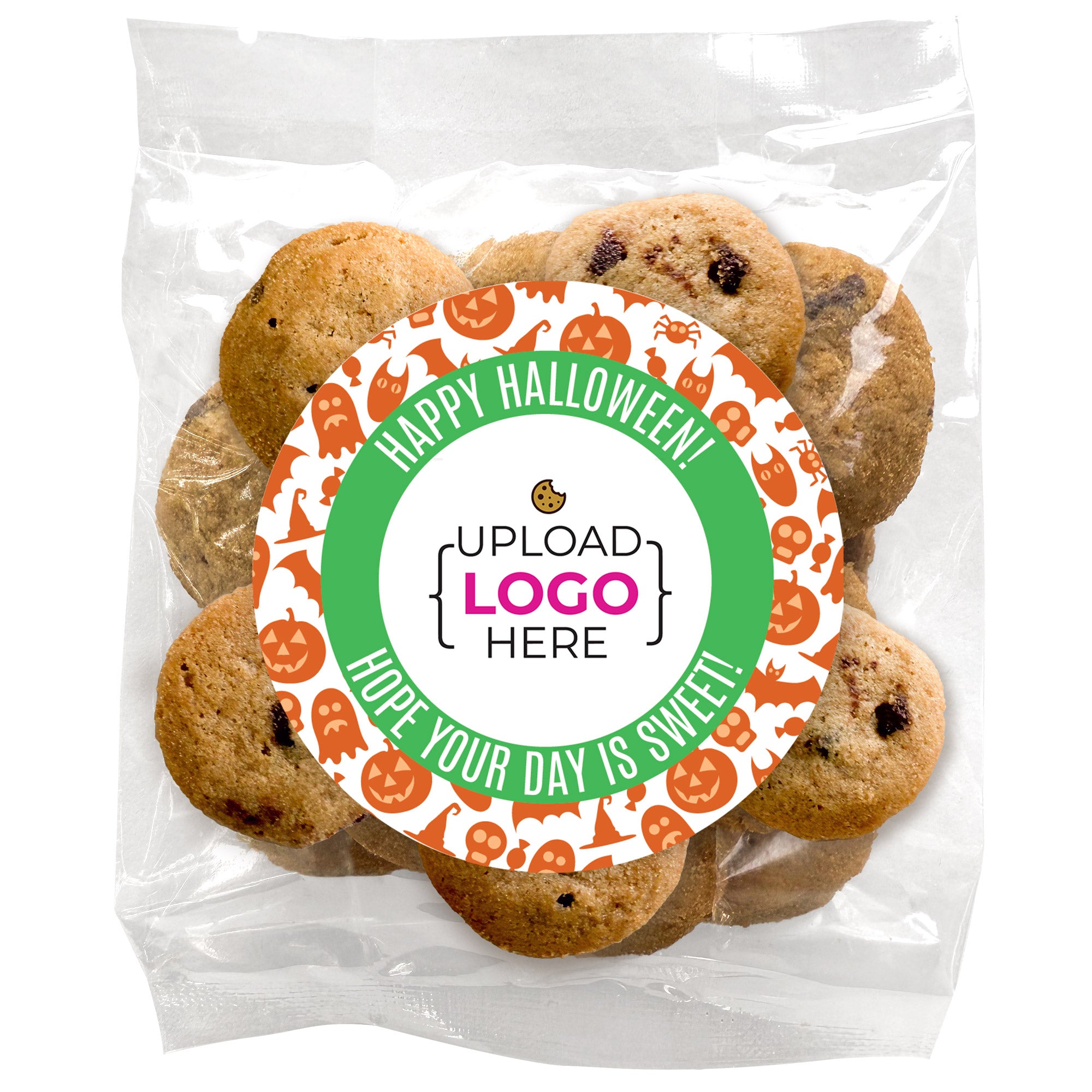 Bite-Sized Chocolate Chip Cookies (2 oz., approx. 14 cookies) W/ Full Color Custom Sticker - Happy Halloween Logo Upload