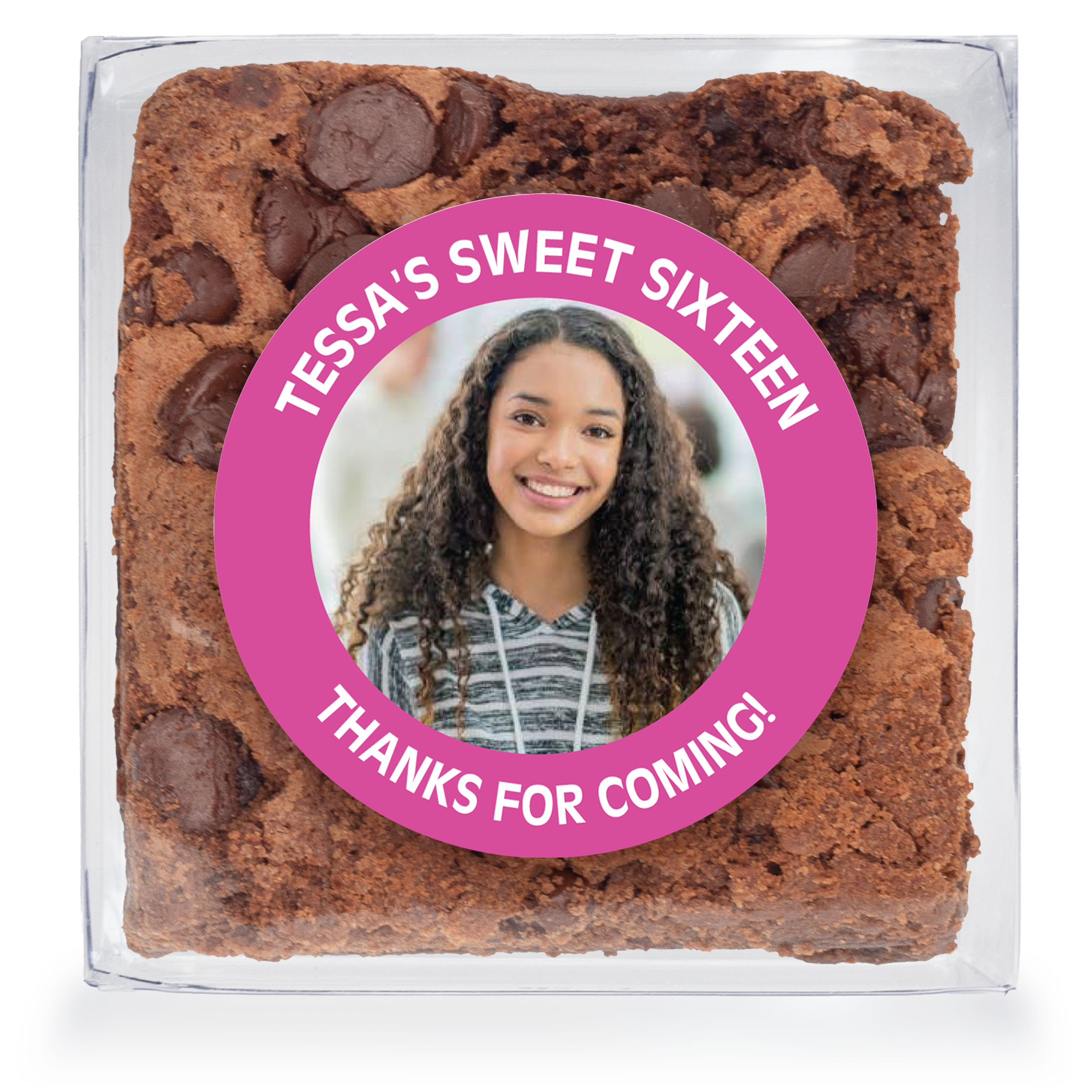 -  Each Brownie is in a clear plastic box & personalized with a full color sticker.