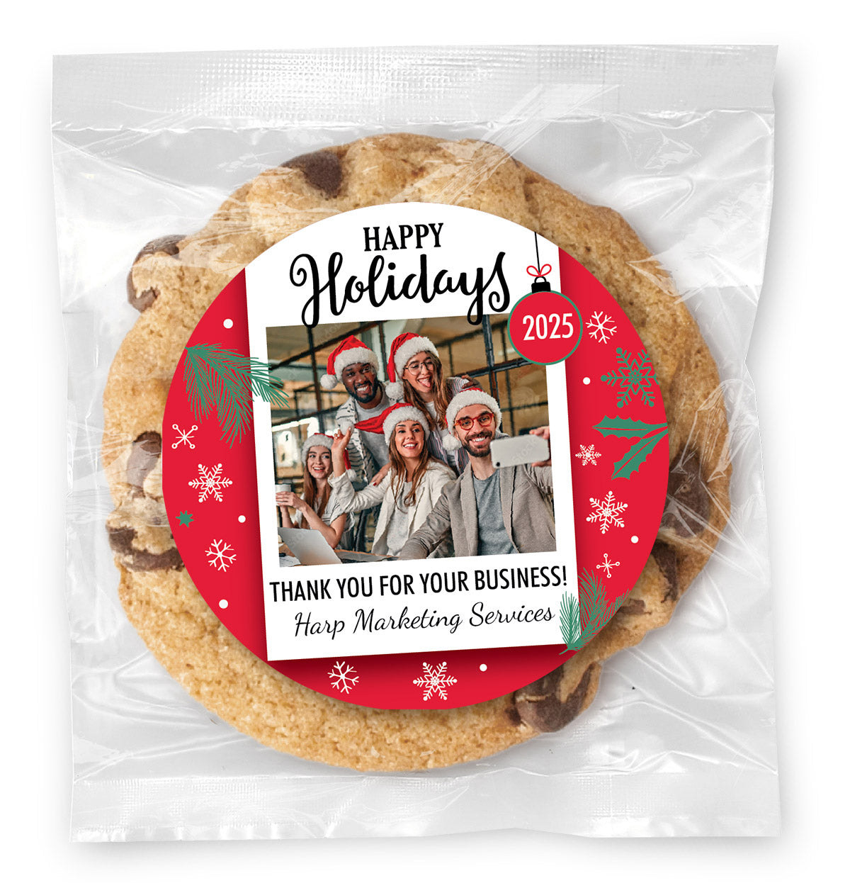 For a rich, gourmet treat, choose our photo cookies topped with a full-color printed sticker. Available in Chocolate Chip, Gluten-Free, Vegan, and other specialty flavors, these cookies are individually wrapped and perfect for gifting or events.
