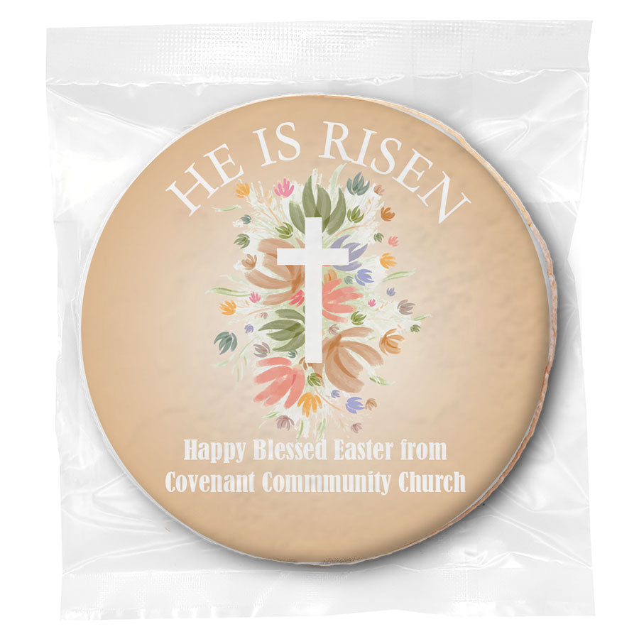 Personalized He Is Risen Floral Cross- Direct Print on Round Sugar Cookies: Celebrate the resurrection with our personalized cookies featuring a "He Is Risen" message printed on round sugar cookies, perfect for Easter celebrations or religious gatherings.