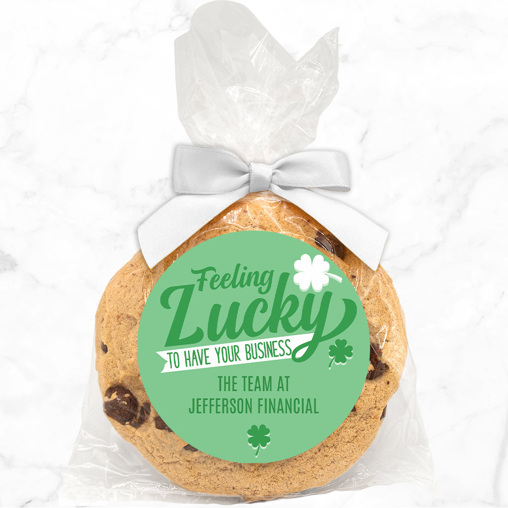 Feeling Lucky to have your Business - Gourmet Chocolate Chip Or Variety Pack W/ Full Color Personalized Sticker w/ Gift Bag & Matching Bow