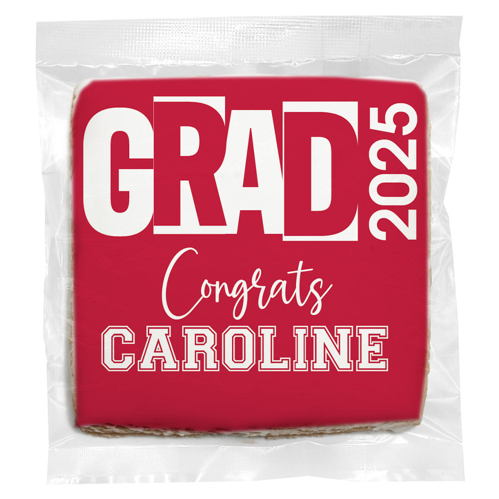 Mark the milestone with custom square sugar cookies featuring bold block letters for the graduate’s name or class year. Each cookie is printed directly with your personalized design, making them perfect for grad parties or school events. A memorable treat for celebrating any graduate.