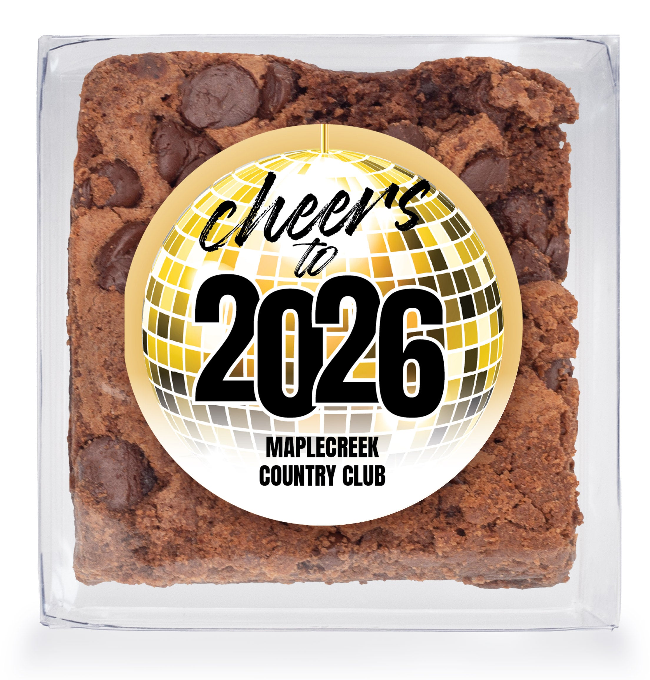 NYE Cheers Disco Ball - Chocolate Chip Fudge Brownies W/Full Color Personalized Sticker
