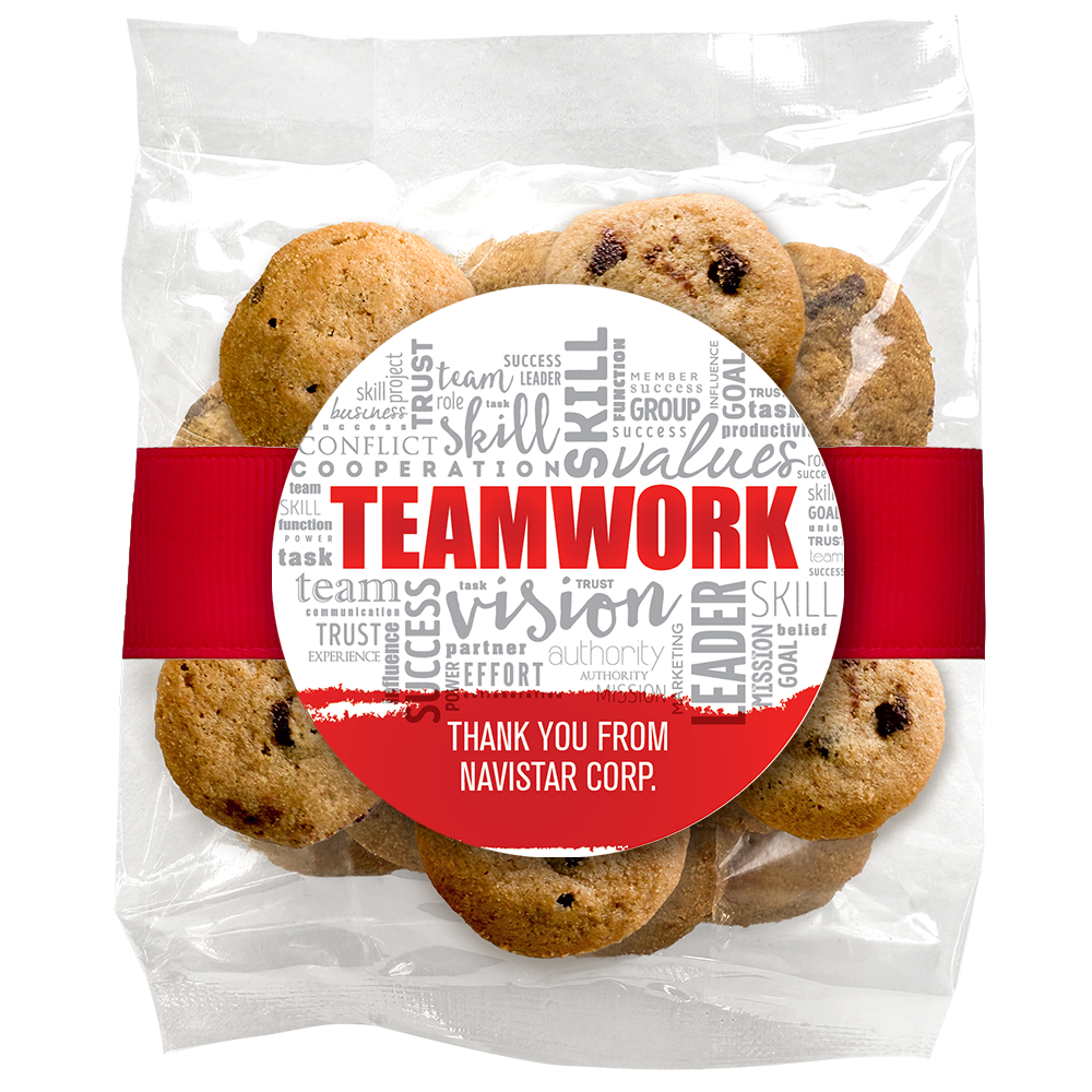 Bite-Sized Chocolate Chip Cookies (2 oz., approx. 14 cookies) W/ Full Color Custom Sticker & Ribbon - Teamwork Message
